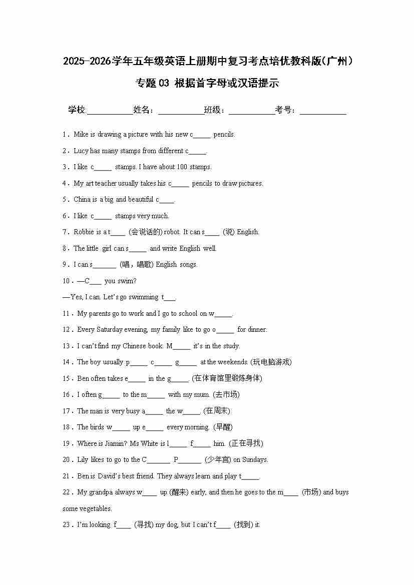 专题03 根据首字母或汉语提示填空-2025-2026学年五年级英语上册期中复习考点培优教科版(广州)(含答案解析)