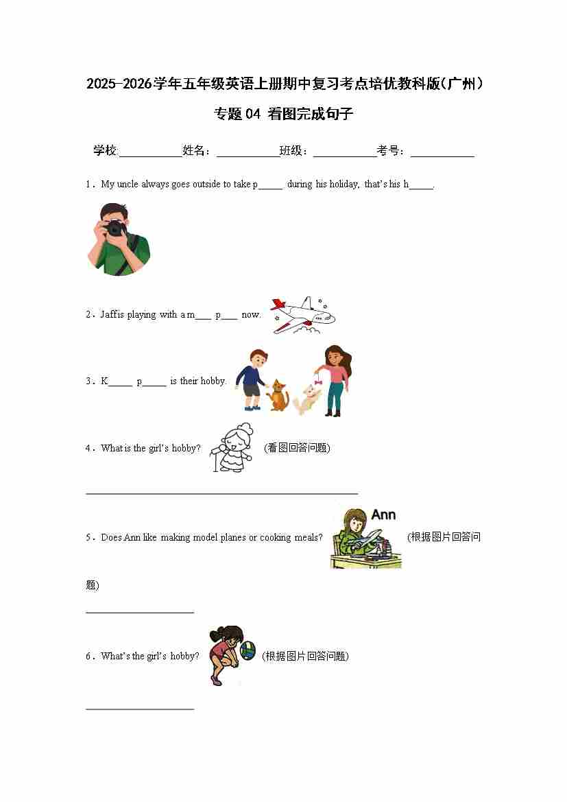 专题04 看图完成句子-2025-2026学年五年级英语上册期中复习考点培优教科版(广州)(含答案解析)