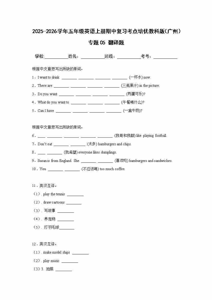 专题05 翻译题-2025-2026学年五年级英语上册期中复习考点培优教科版(广州)(含答案解析)
