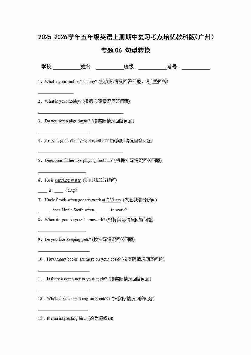 专题06 句型转换-2025-2026学年五年级英语上册期中复习考点培优教科版(广州)(含答案解析)