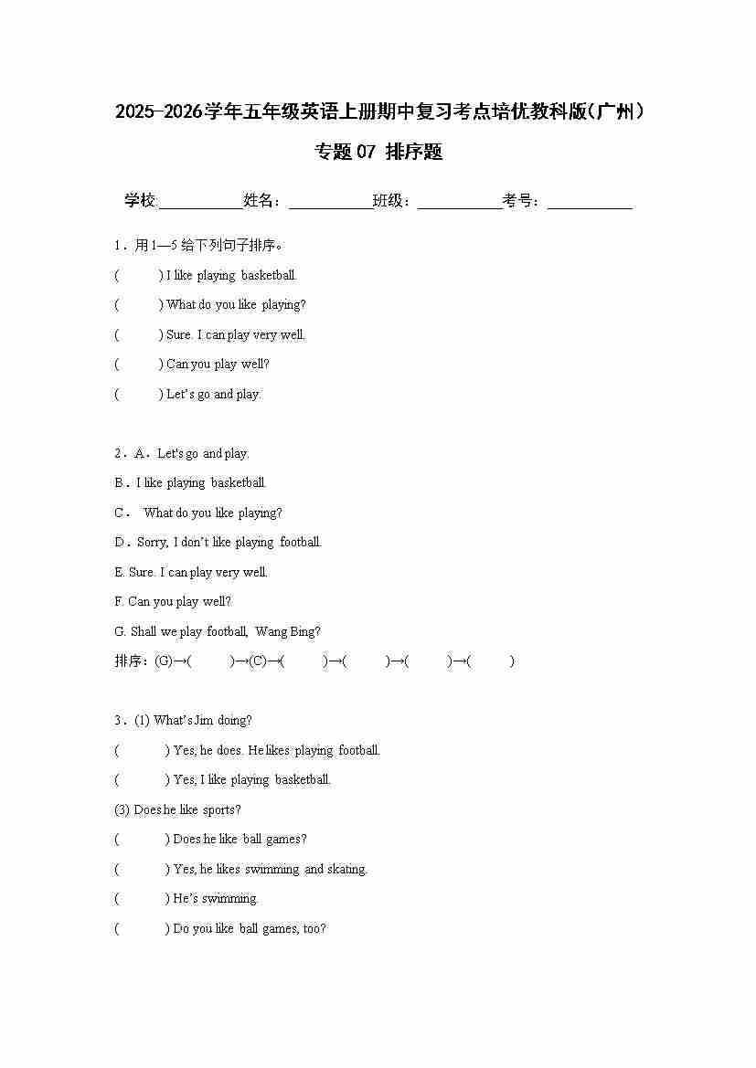 专题07 排序题-2025-2026学年五年级英语上册期中复习考点培优教科版(广州)(含答案解析)