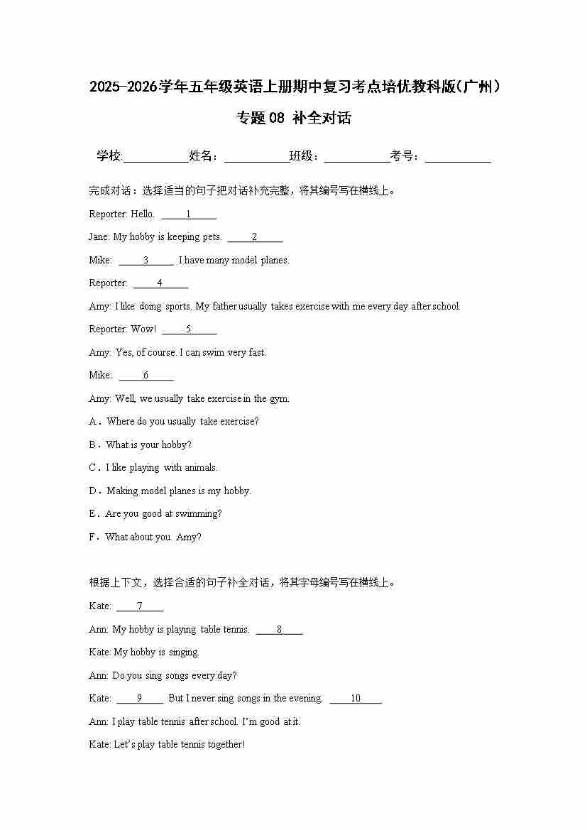 专题08 补全对话-2025-2026学年五年级英语上册期中复习考点培优教科版(广州)(含答案解析)