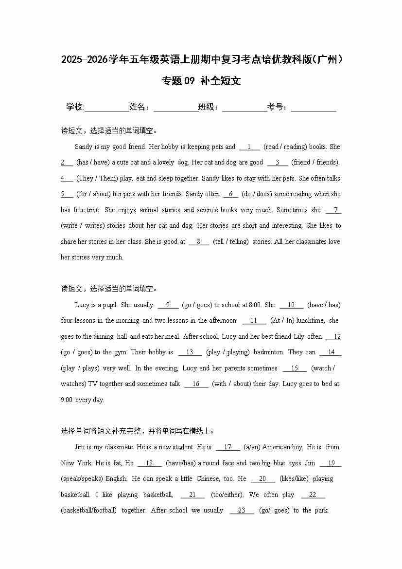 专题09 补全短文-2025-2026学年五年级英语上册期中复习考点培优教科版(广州)(含答案解析)