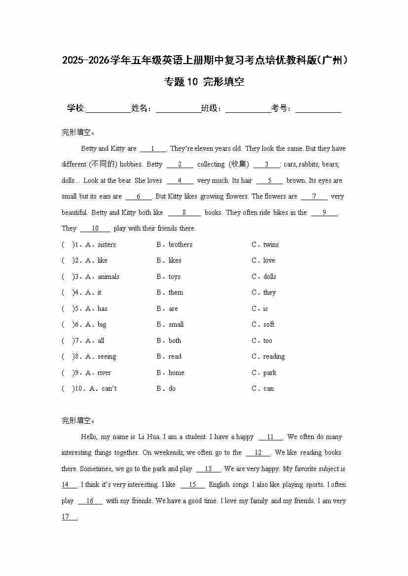 专题10 完形填空-2025-2026学年五年级英语上册期中复习考点培优教科版(广州)(含答案解析)