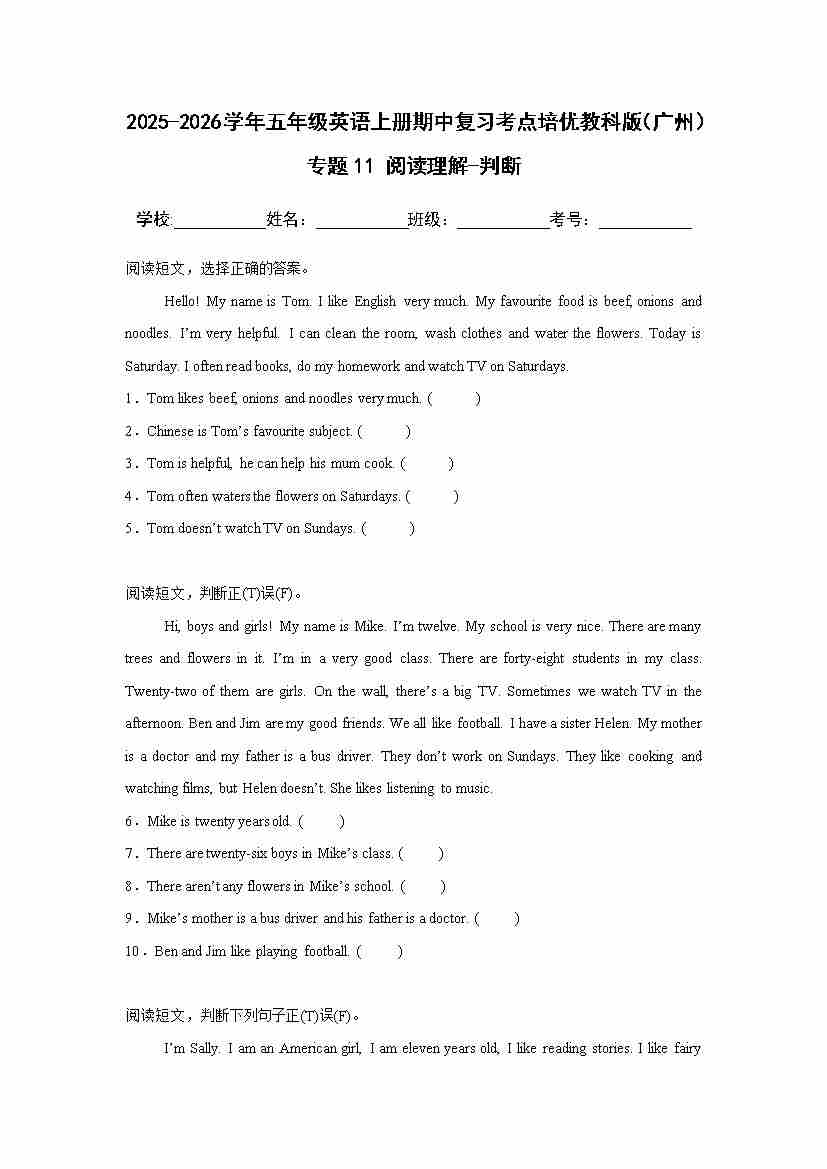 专题11 阅读理解-判断-2025-2026学年五年级英语上册期中复习考点培优教科版(广州)(含答案解析)