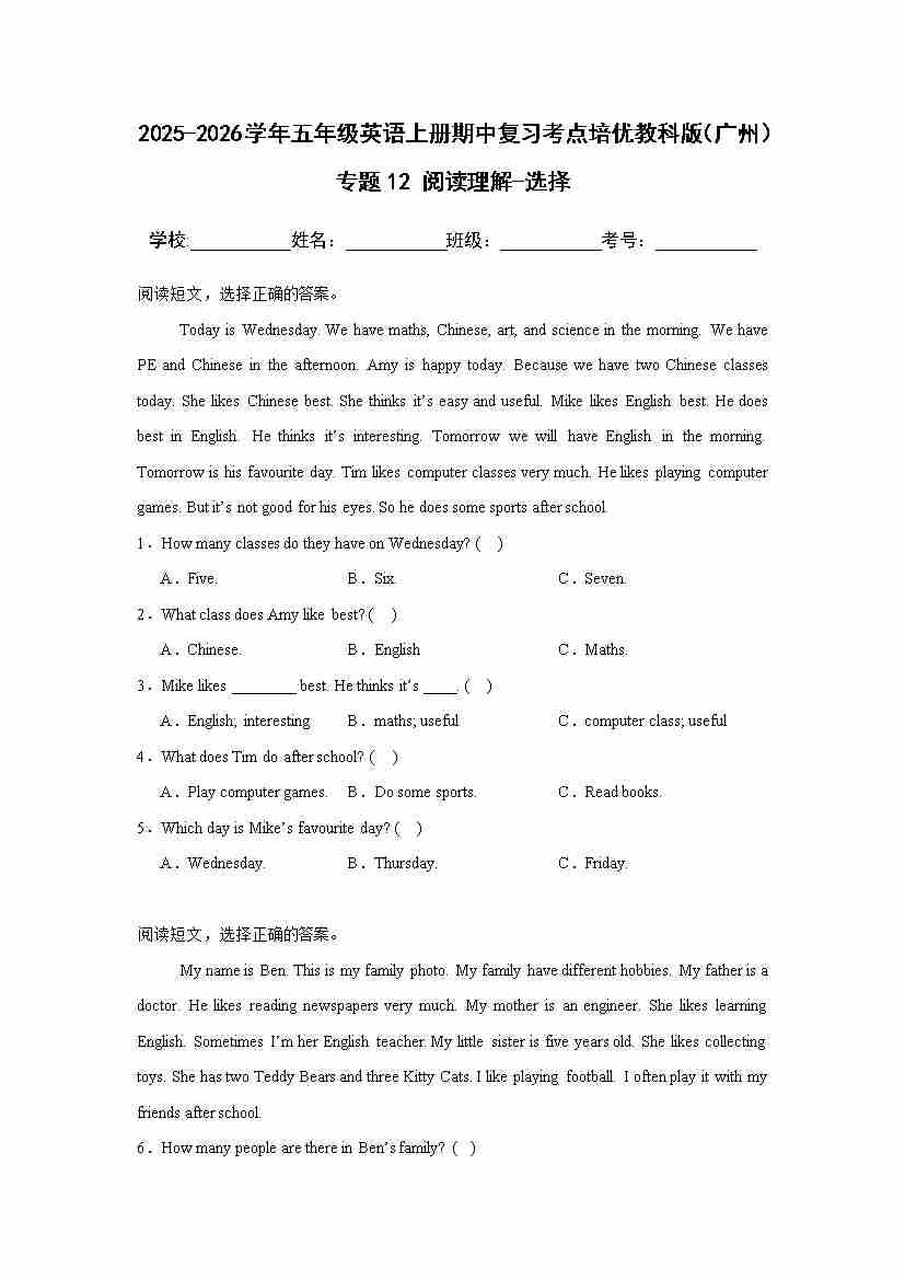 专题12 阅读理解-选择-2025-2026学年五年级英语上册期中复习考点培优教科版(广州)(含答案解析)