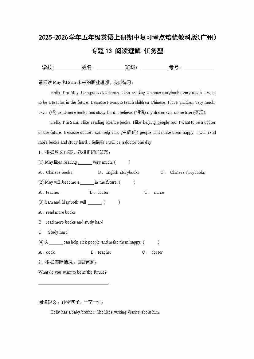 专题13 阅读理解-任务型-2025-2026学年五年级英语上册期中复习考点培优教科版(广州)(含答案解析)