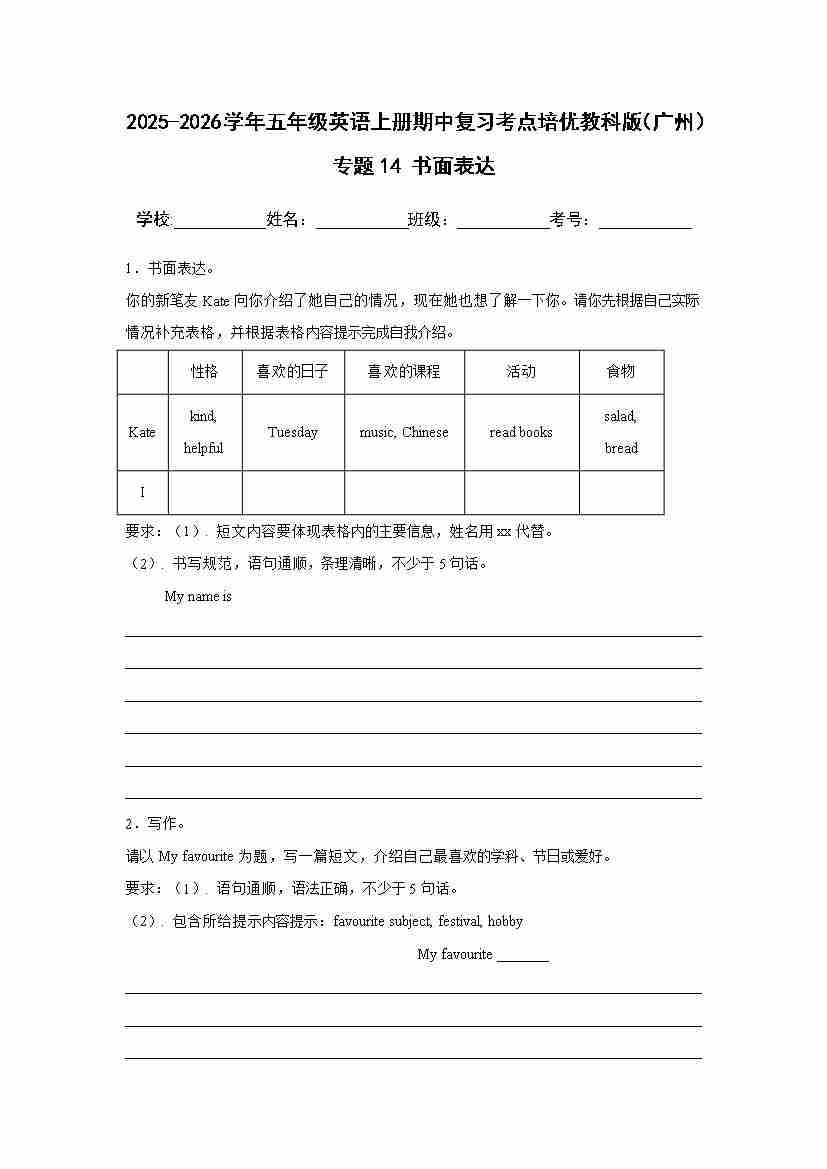 专题14 书面表达-2025-2026学年五年级英语上册期中复习考点培优教科版(广州)(含答案解析)
