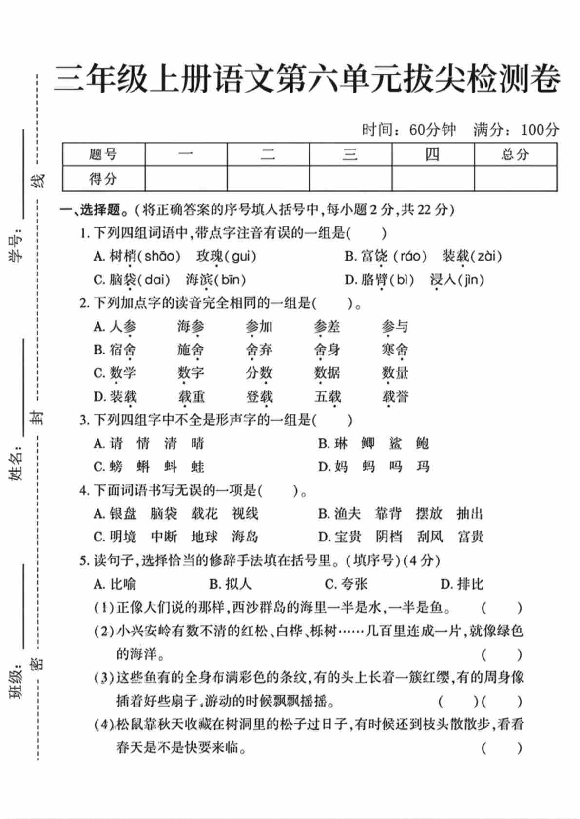 三年级(上)语文 第六单元拔尖测试卷2