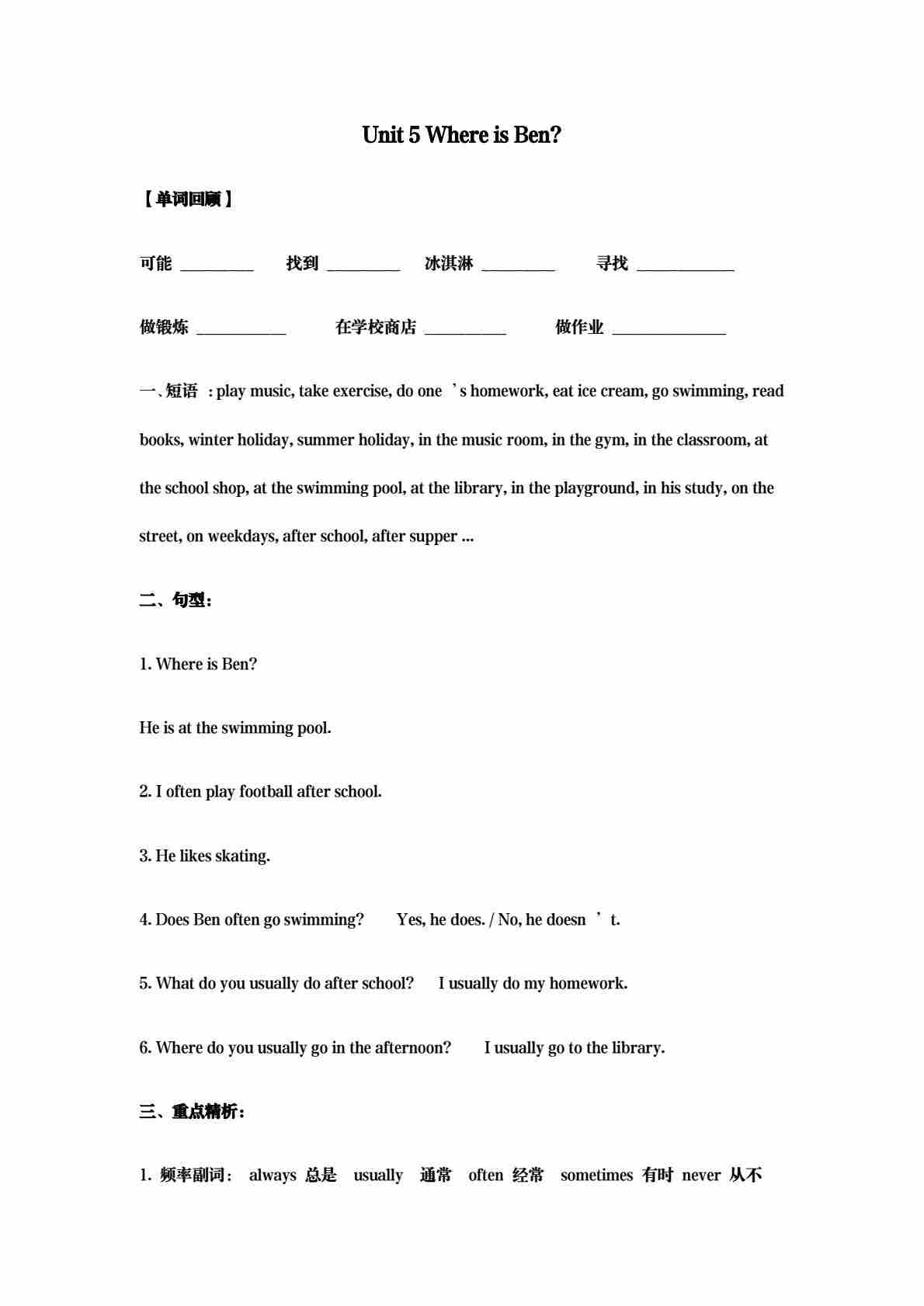 五年级(上)英语 Unit 5 Where is Ben基础练习