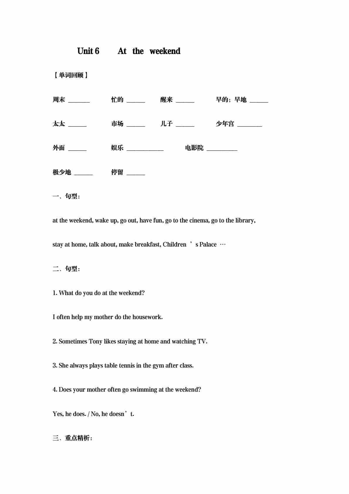 五年级(上)英语 Unit 6 At the weekend 基础练习