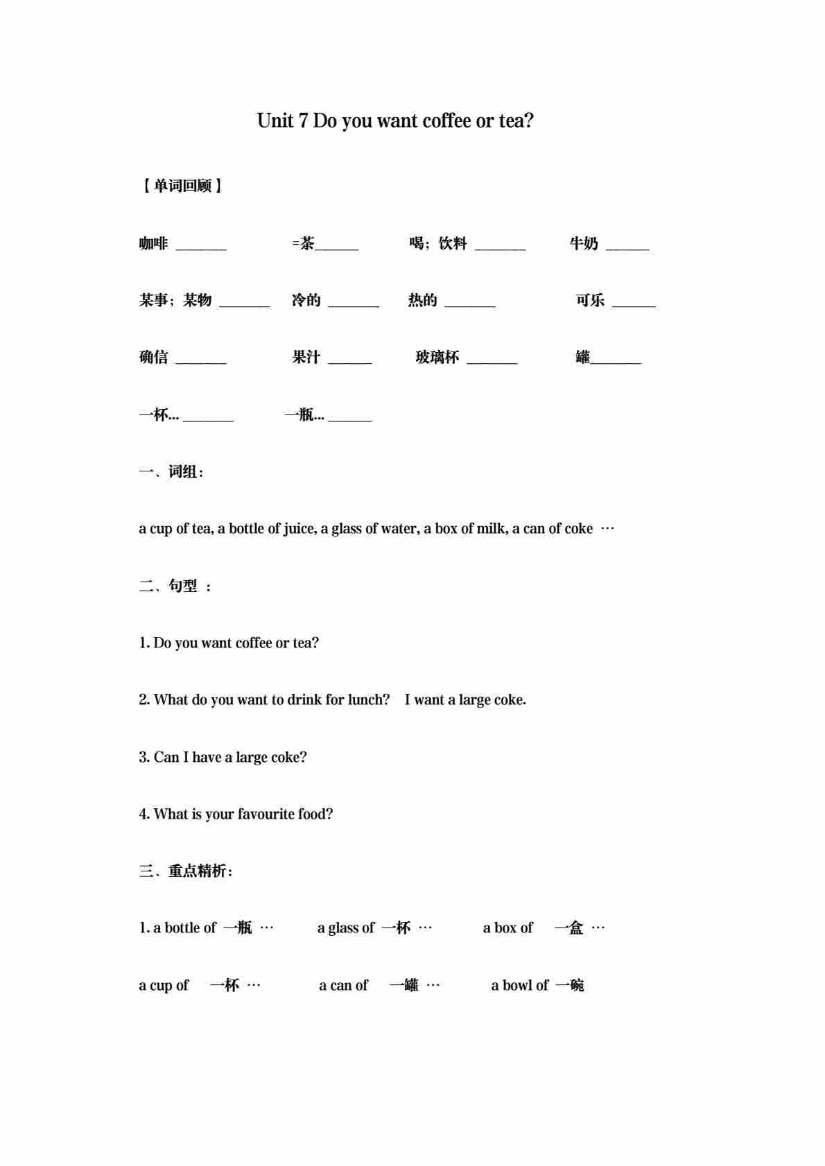 五年级(上)英语 Unit 7 Do you want coffee or tea基础练习