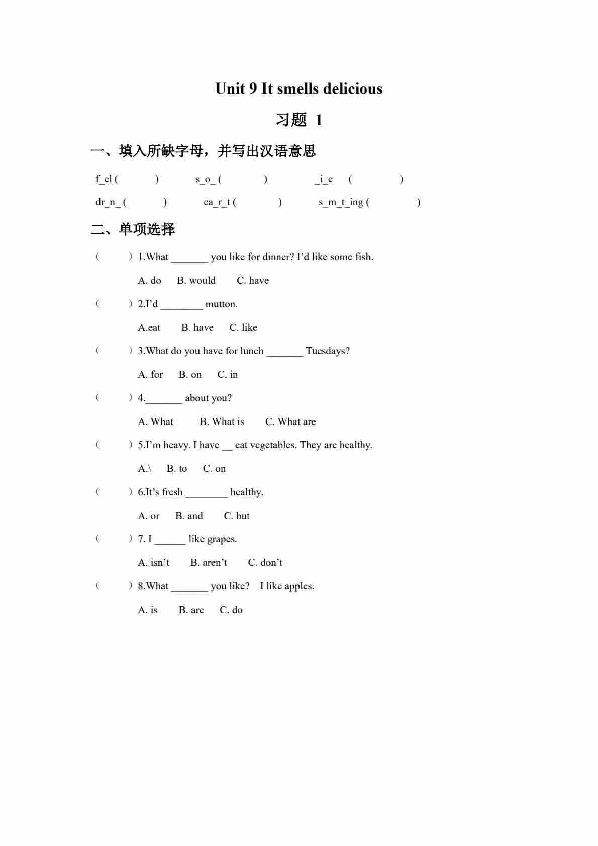 五年级(上)英语 Unit 9 It smells delicious 基础练习
