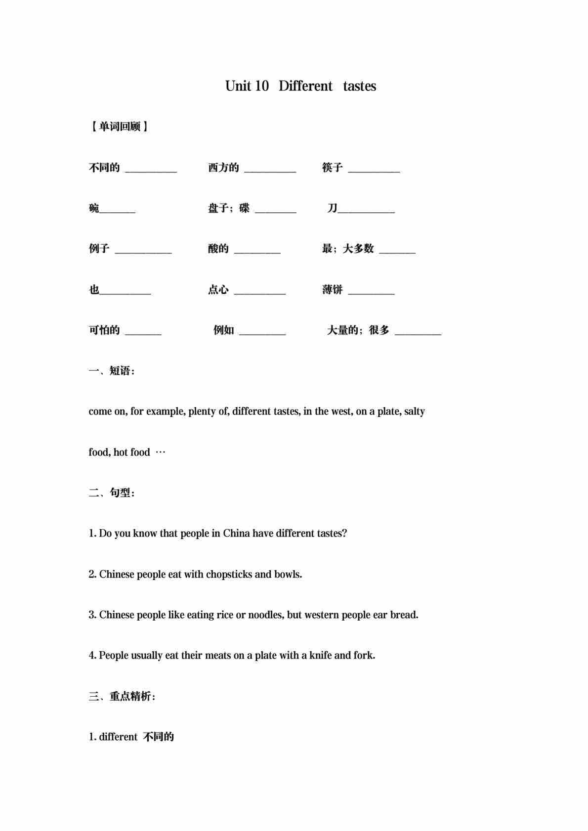 五年级(上)英语 Unit10 Different tastes 基础练习
