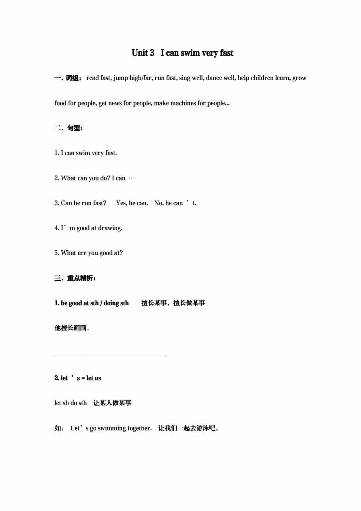 五年级(上)英语 Unit3 I can swim very fast 基础练习