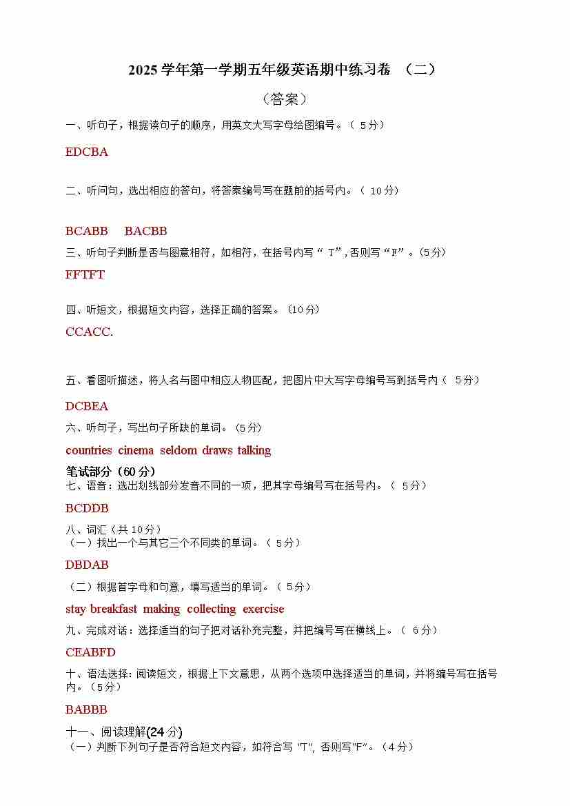 第一学期五年级英语期中练习卷(二)(答案)