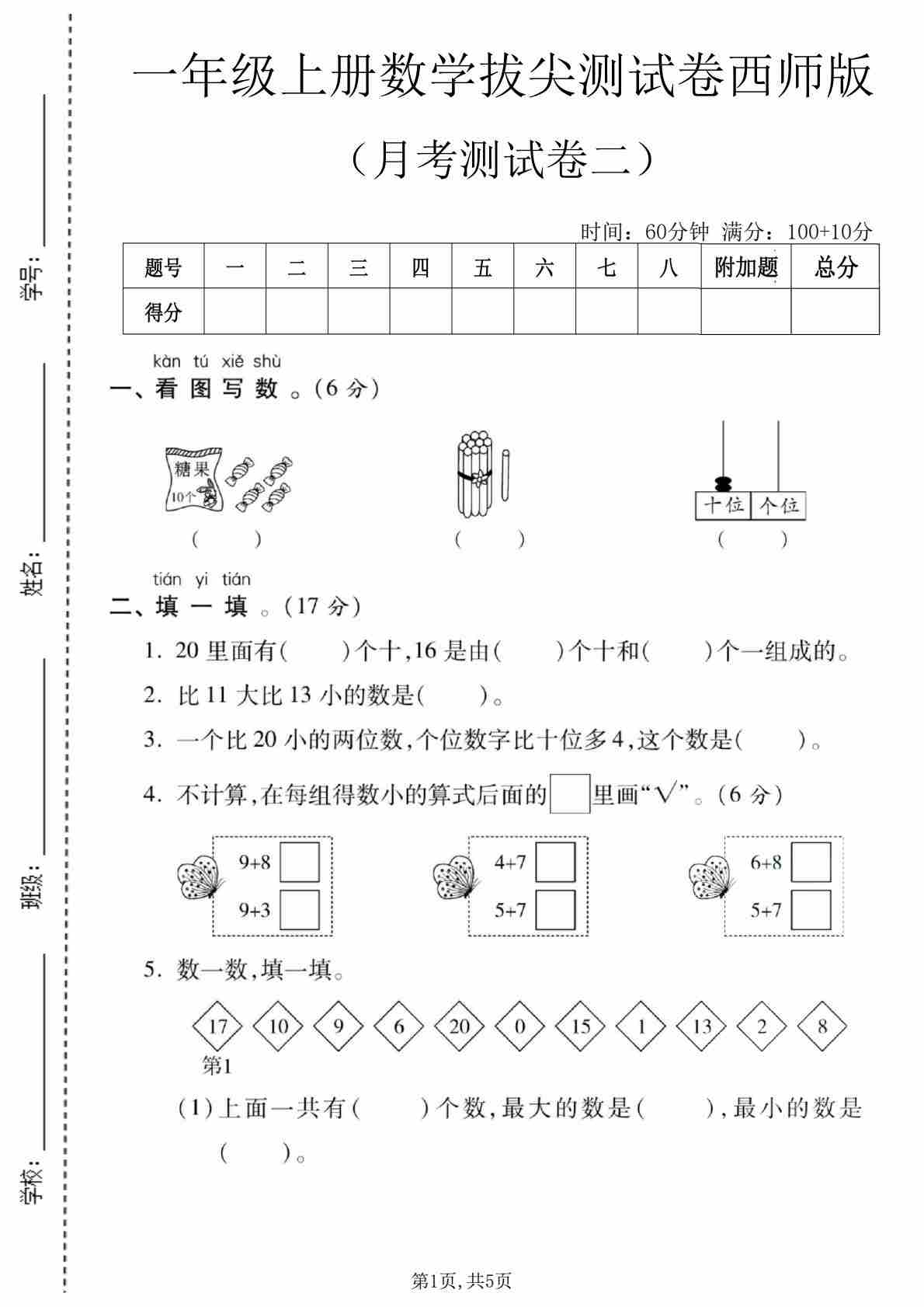 一年级(上)数学第二次月考测试卷《西师版》