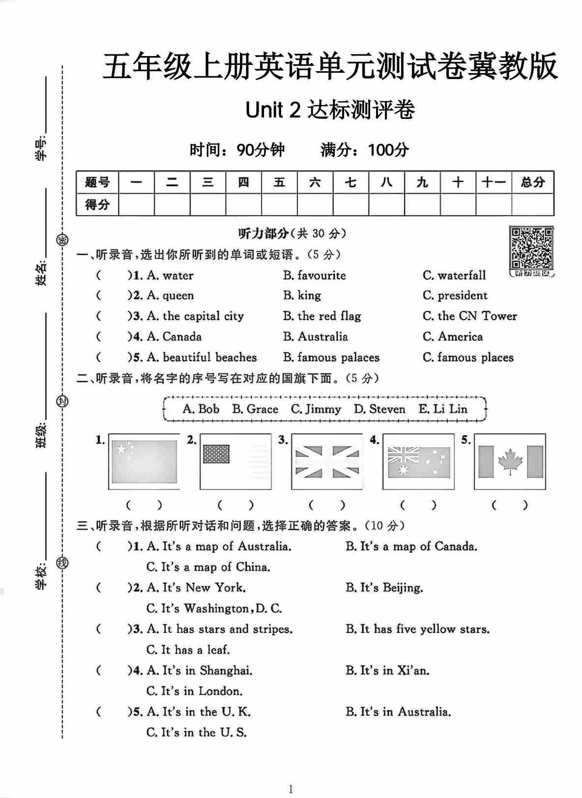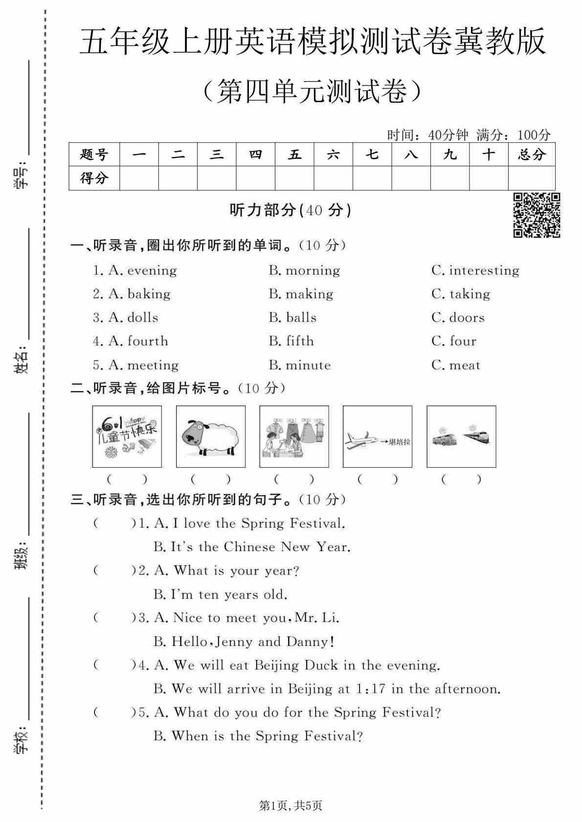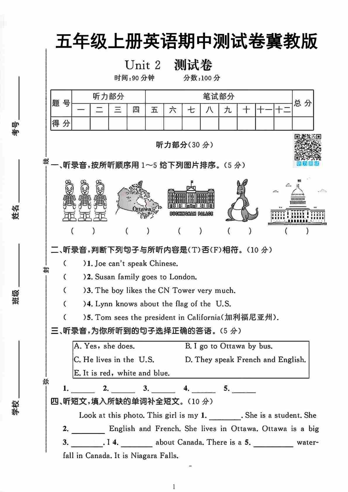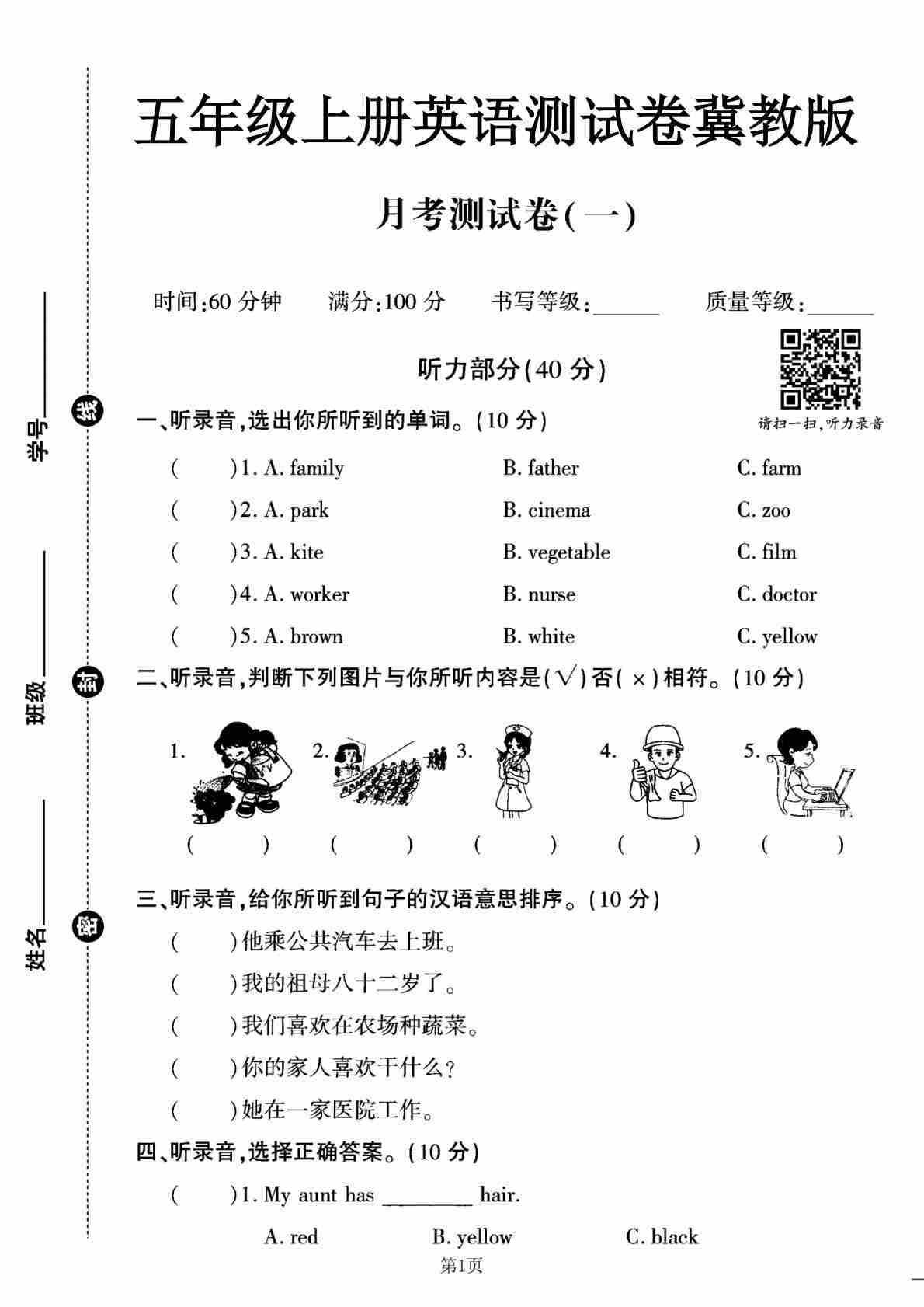 五年级(上)英语 第一次月考卷《冀教版》