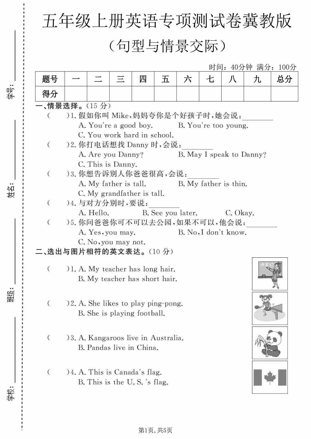 五年级(上)英语 句型与情景交际专项测试卷《冀教版》