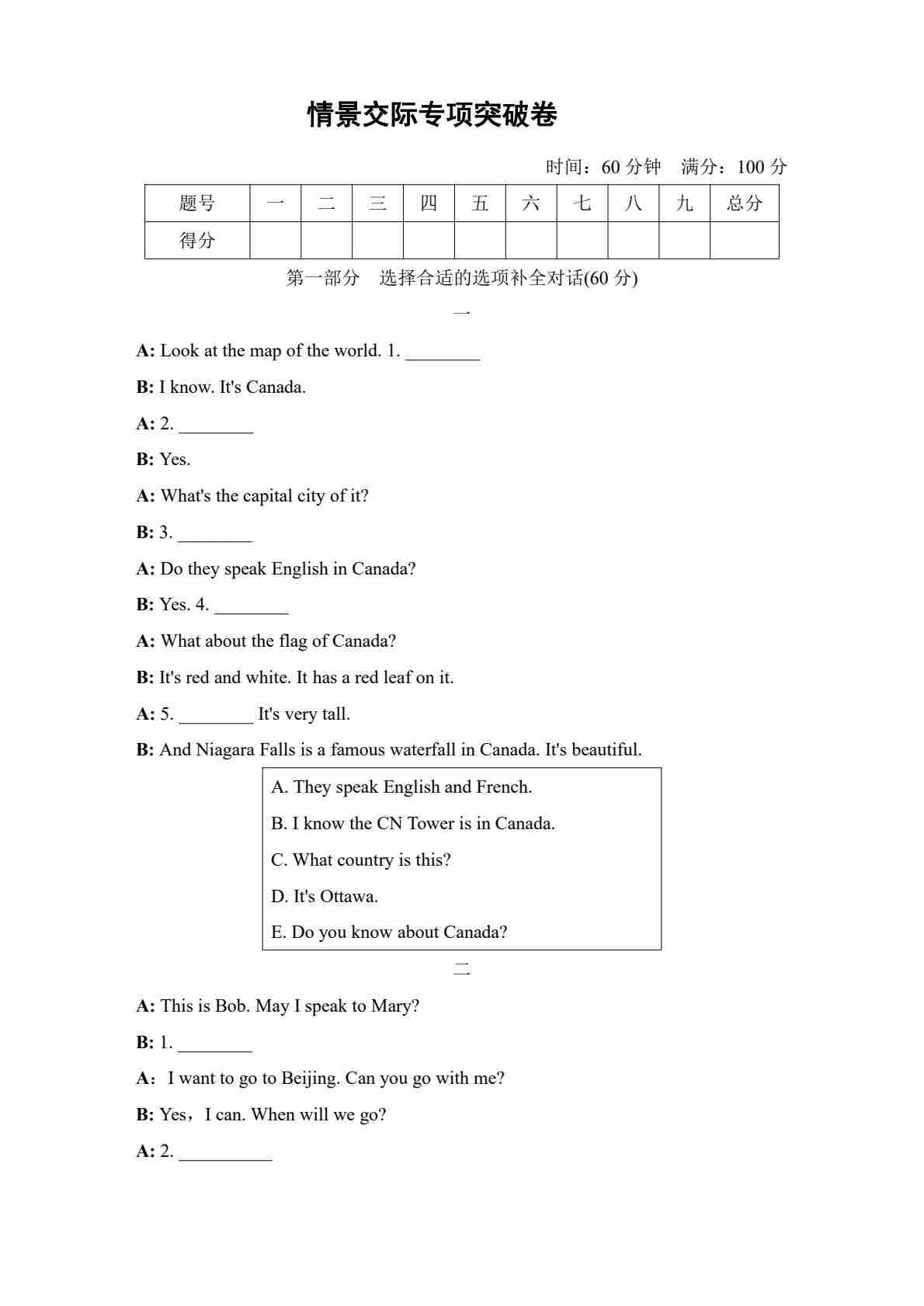 五年级(上)英语 情景交际专项突破卷《冀教版》