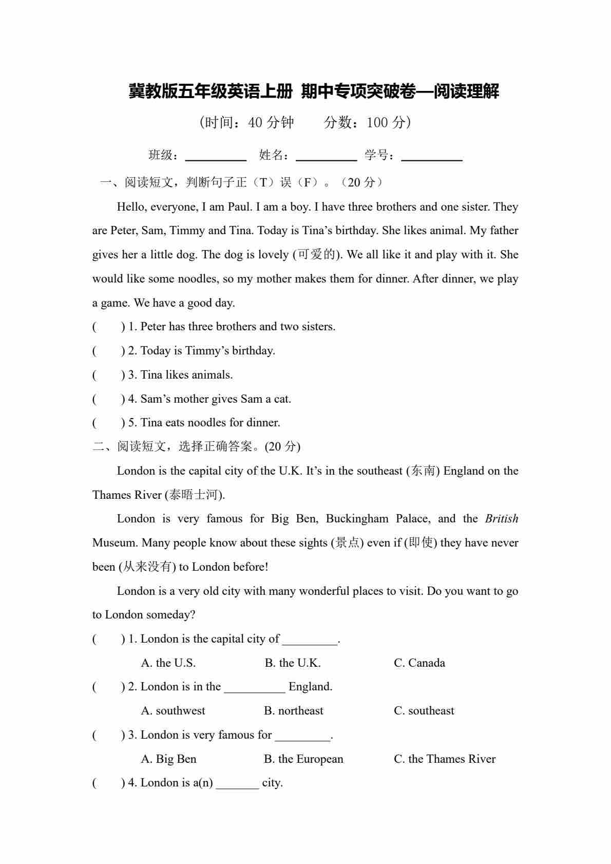 五年级(上)英语 期中专项突破卷-阅读理解《冀教版》