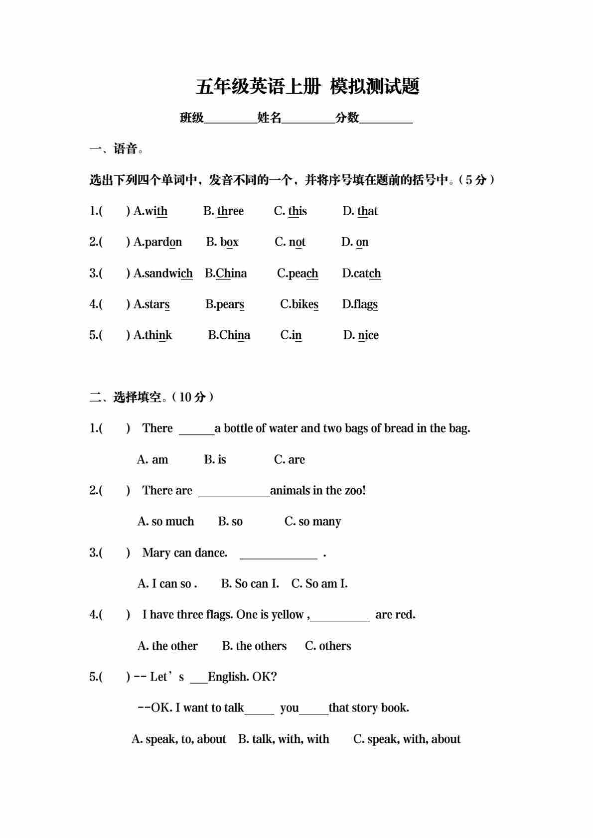 五年级(上)英语 模拟测试题