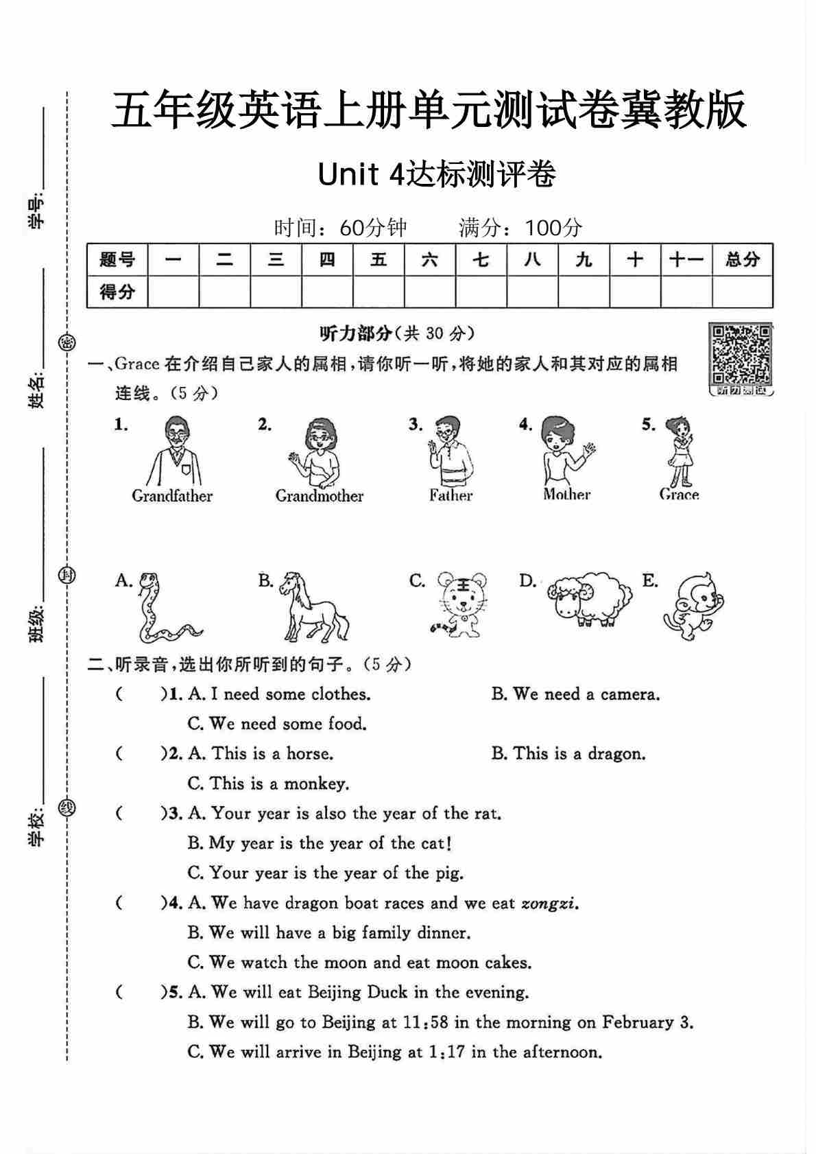 五年级(上)英语 第四单元测试卷《冀教版》