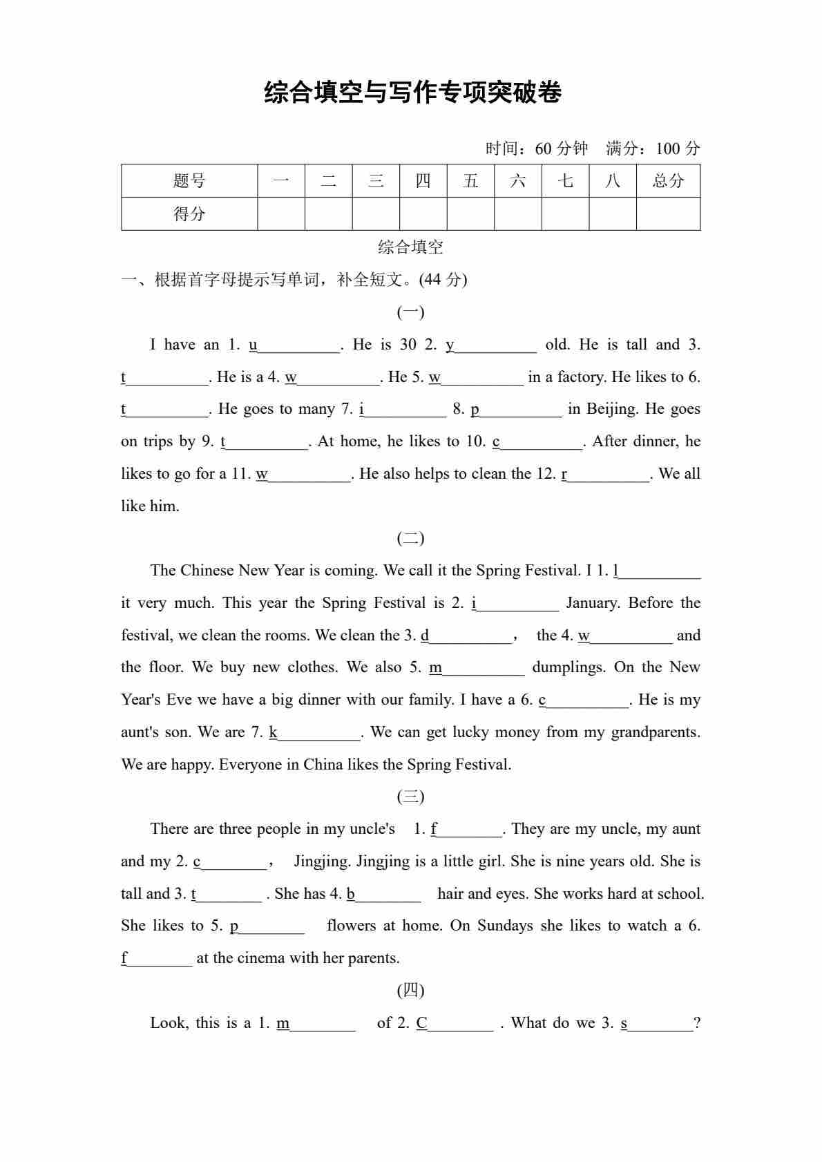 五年级(上)英语 综合填空与写作专项突破卷《冀教版》