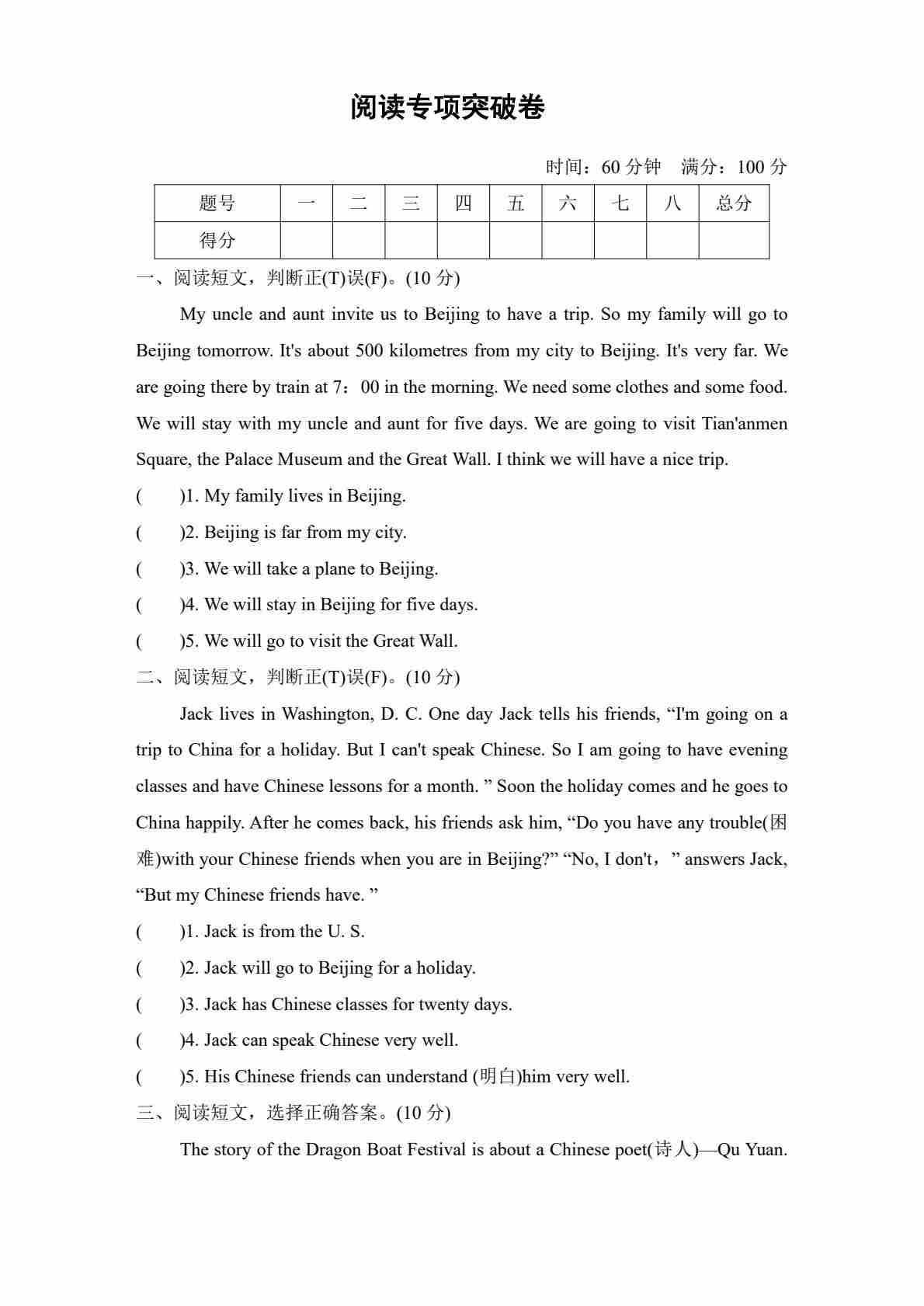 五年级(上)英语 阅读专项突破卷《冀教版》
