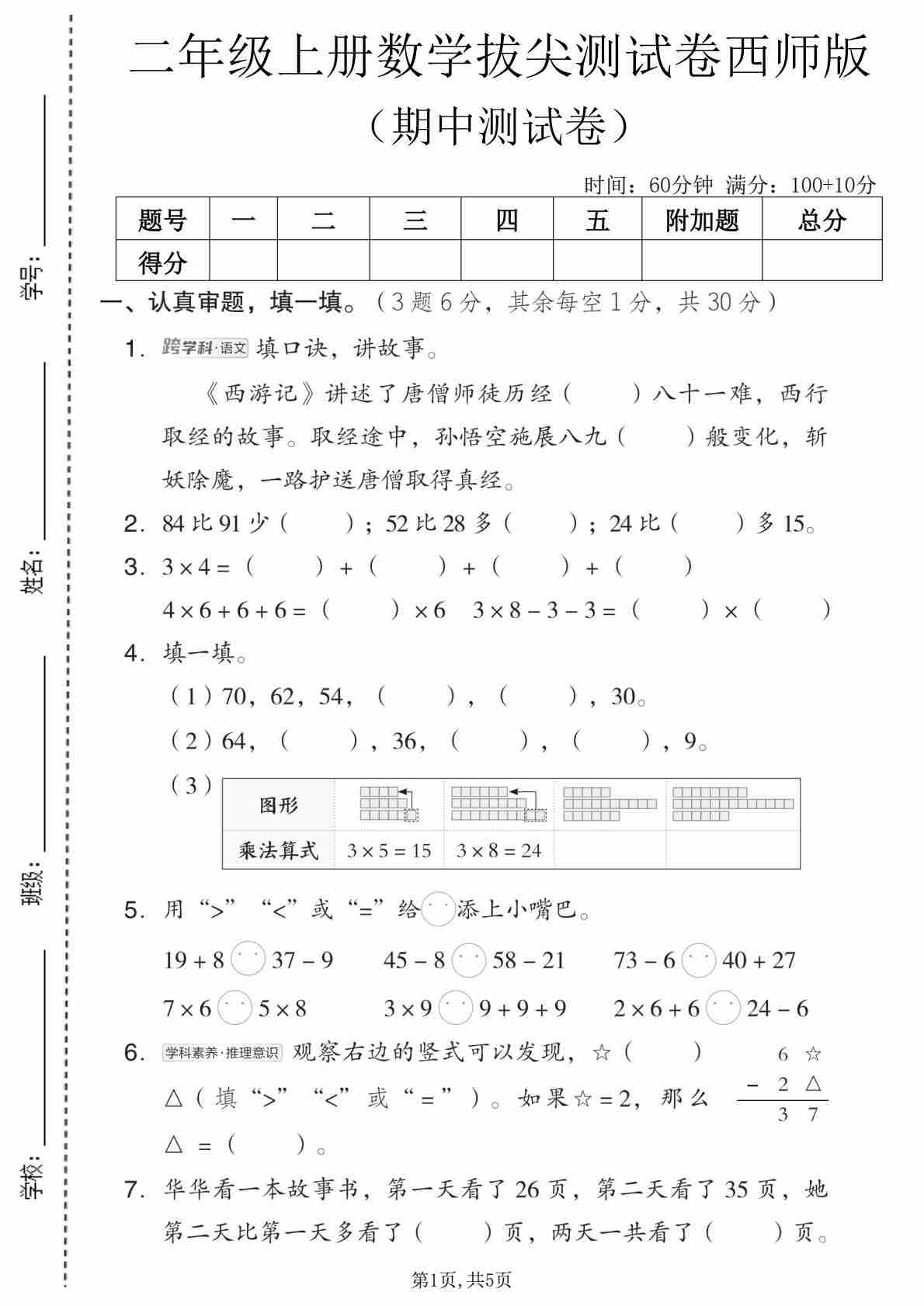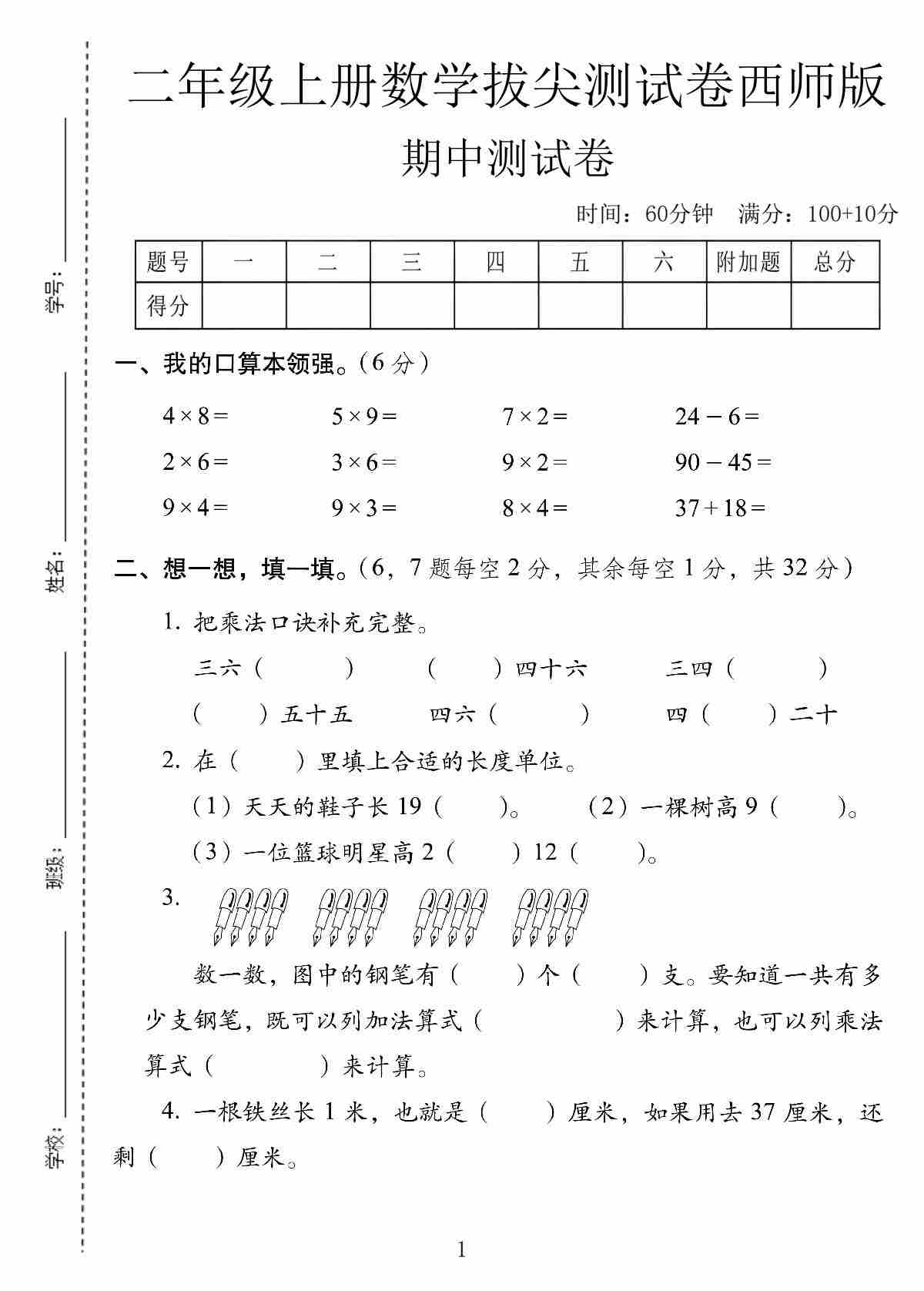 二年级(上)数学 期中测试卷《西师版》