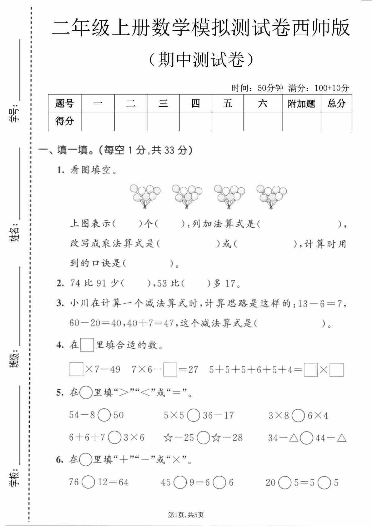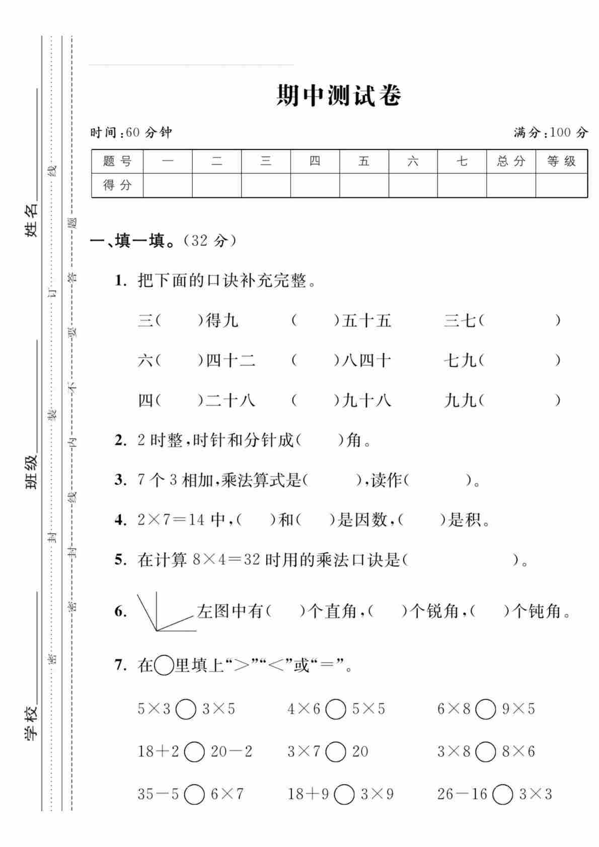 二年级(上)数学 期中模拟测试卷《西师版》