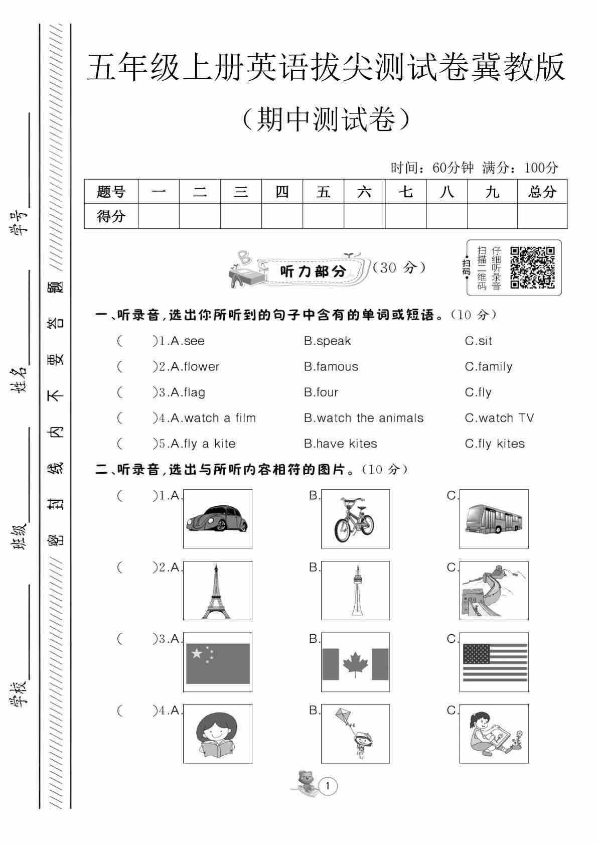 五年级(上)英语 期中达标测试卷《冀教版》(1)