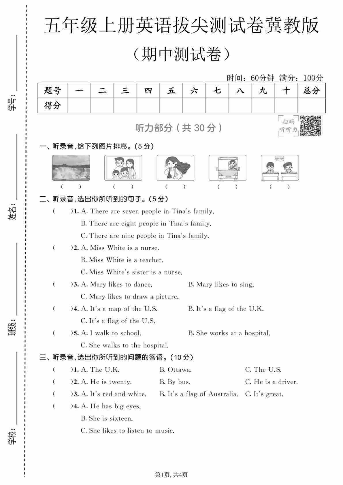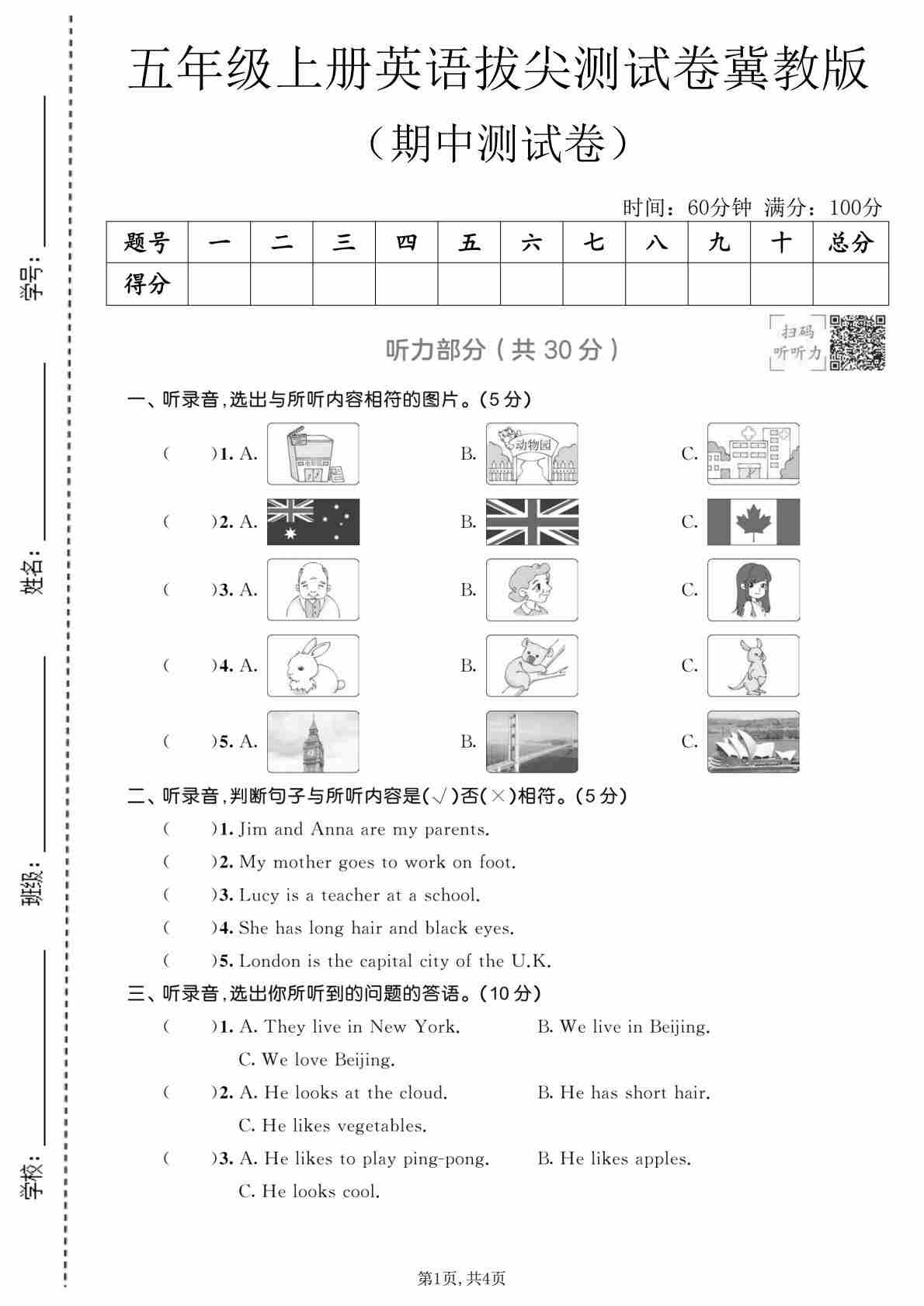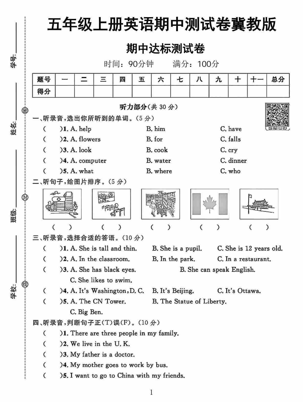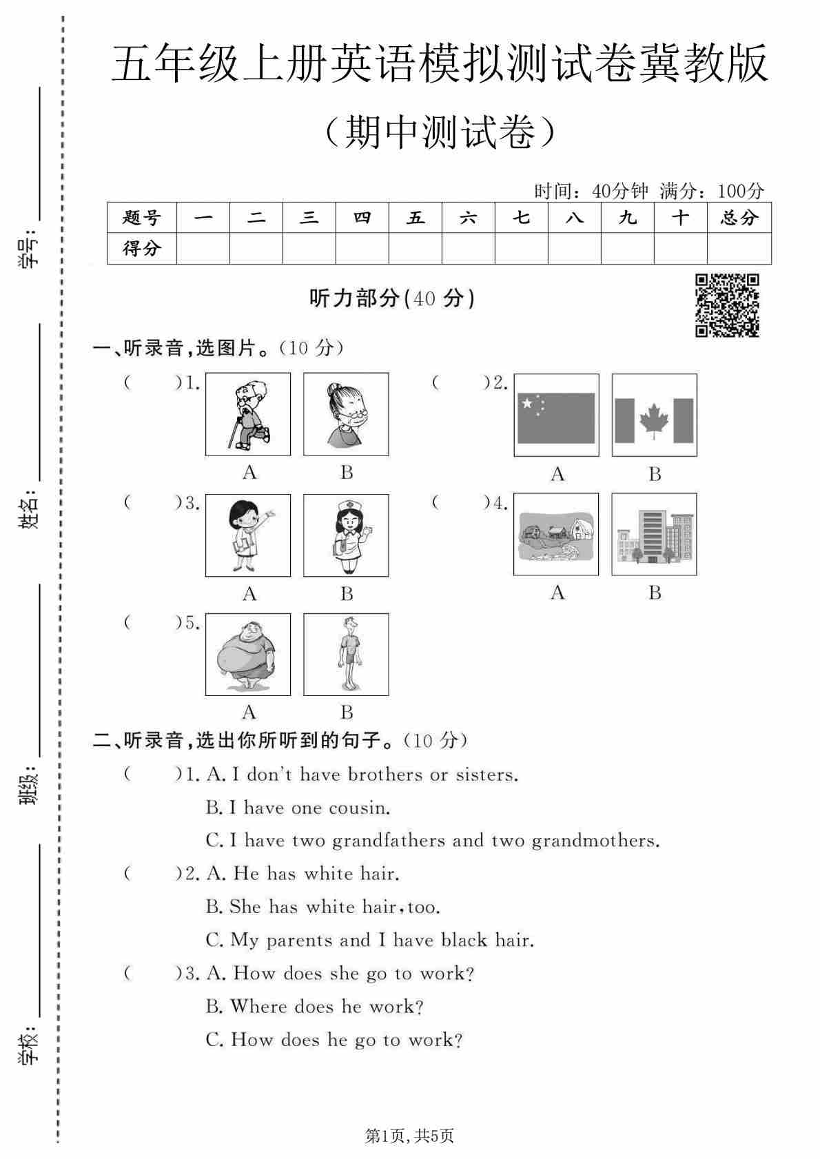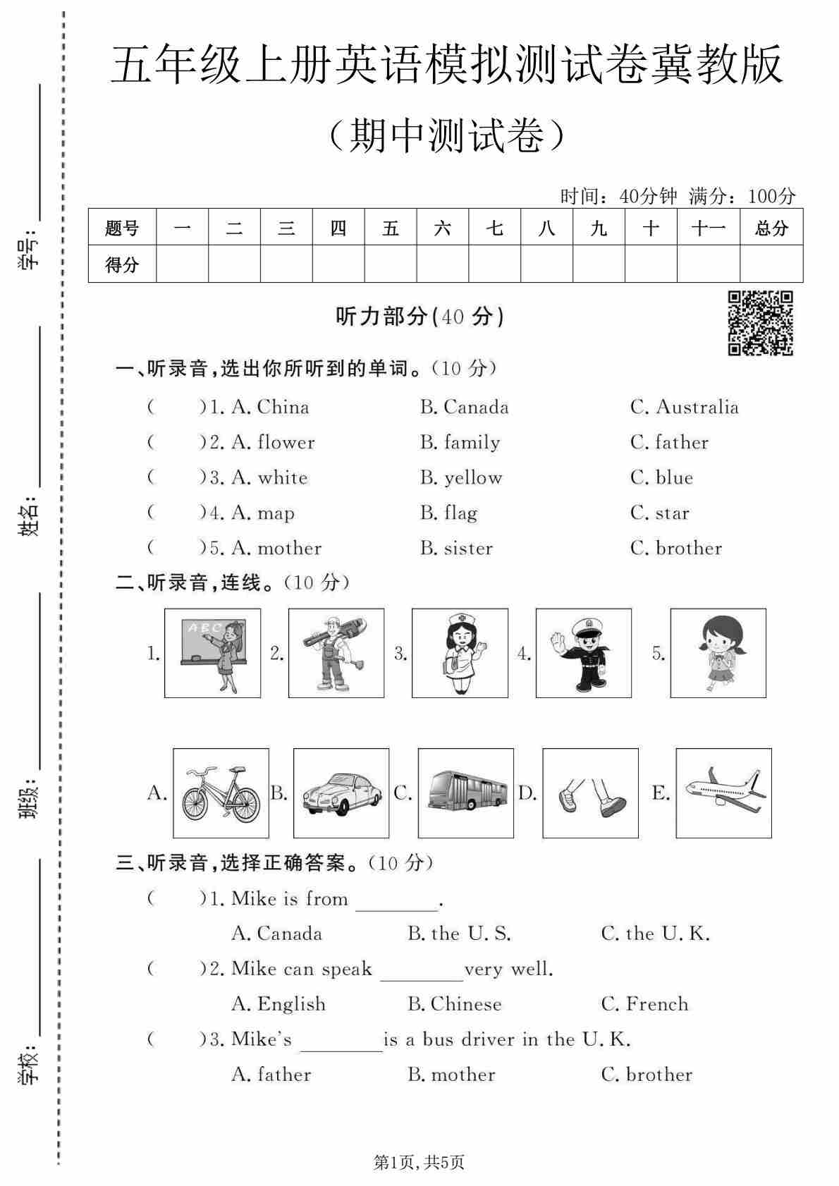 五年级(上)英语 期中测试卷《冀教版》45