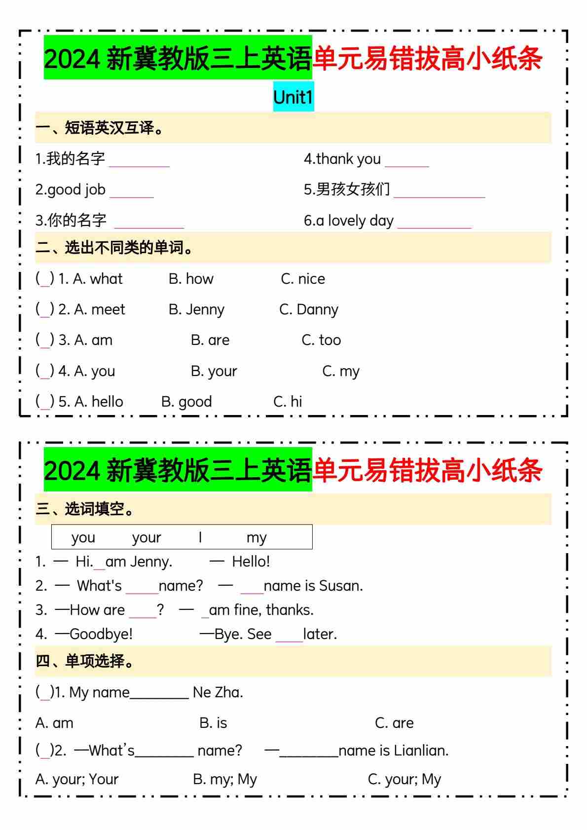 2024 新冀教版三上英语单元易错拔高小纸条【空白】
