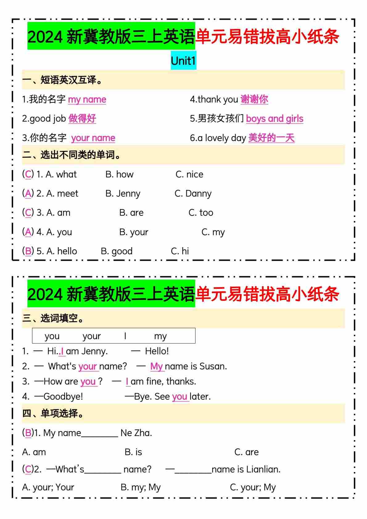 2024 新冀教版三上英语单元易错拔高小纸条【答案】