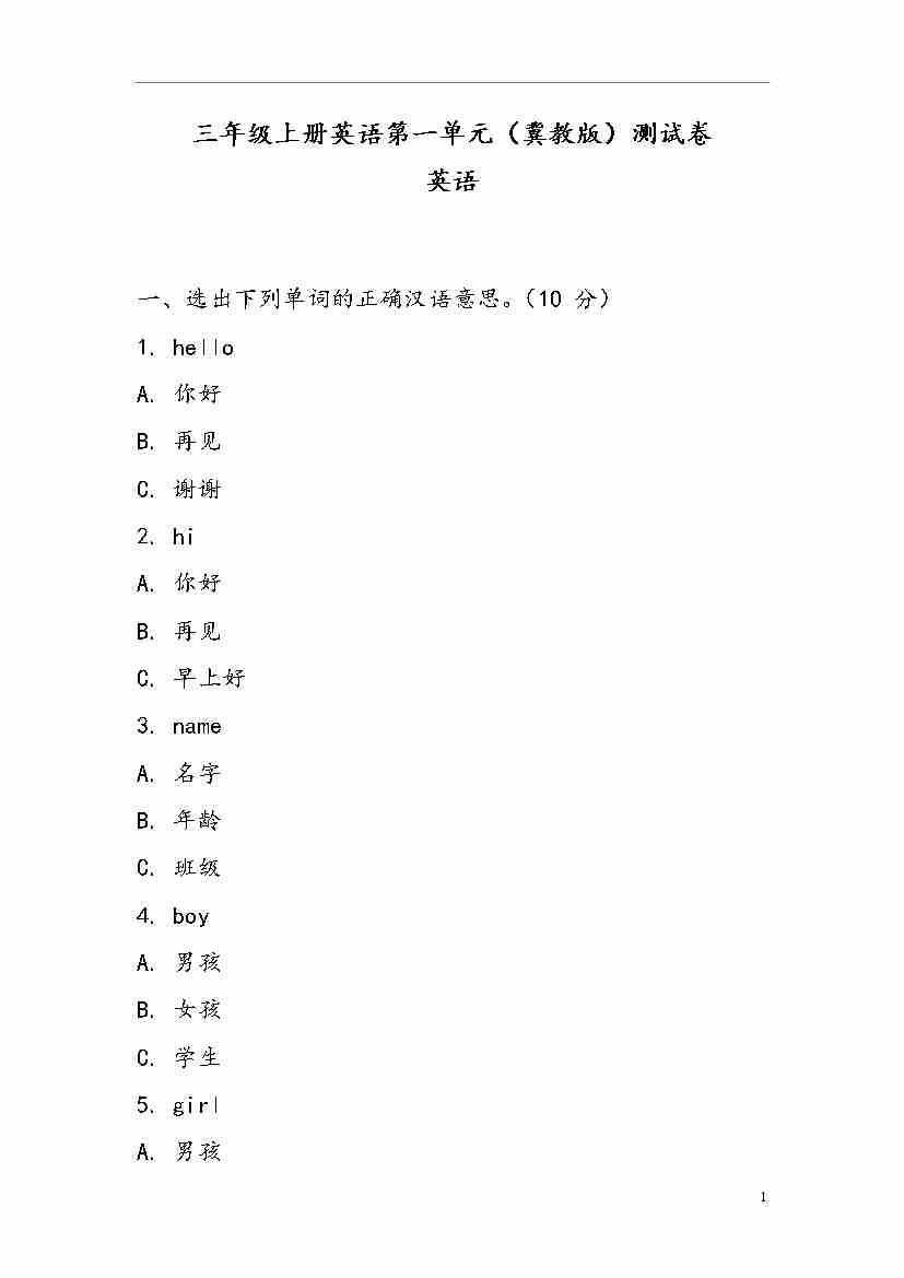 Unit 1 Hello (单元测试)-2024-2025学年冀教版(三起)(2024)英语三年级上册
