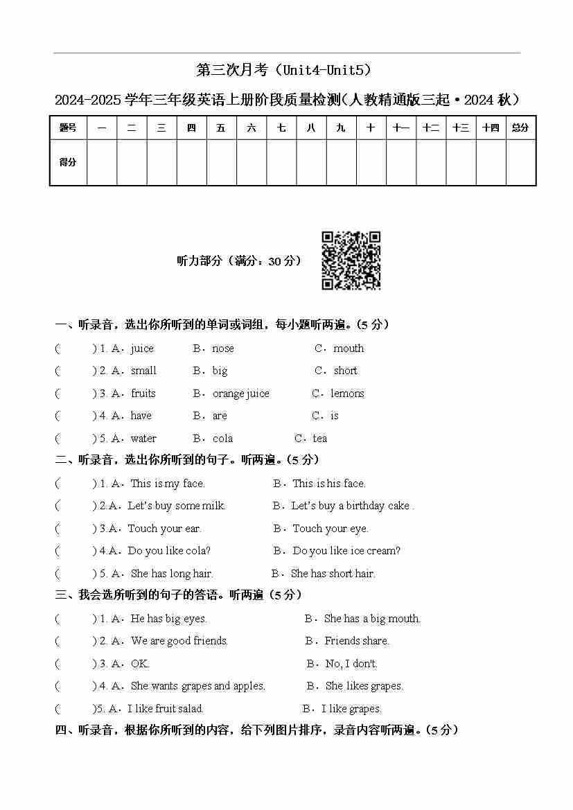 三上人教精通第三次月考(Unit4-Unit5)(考试版A4)