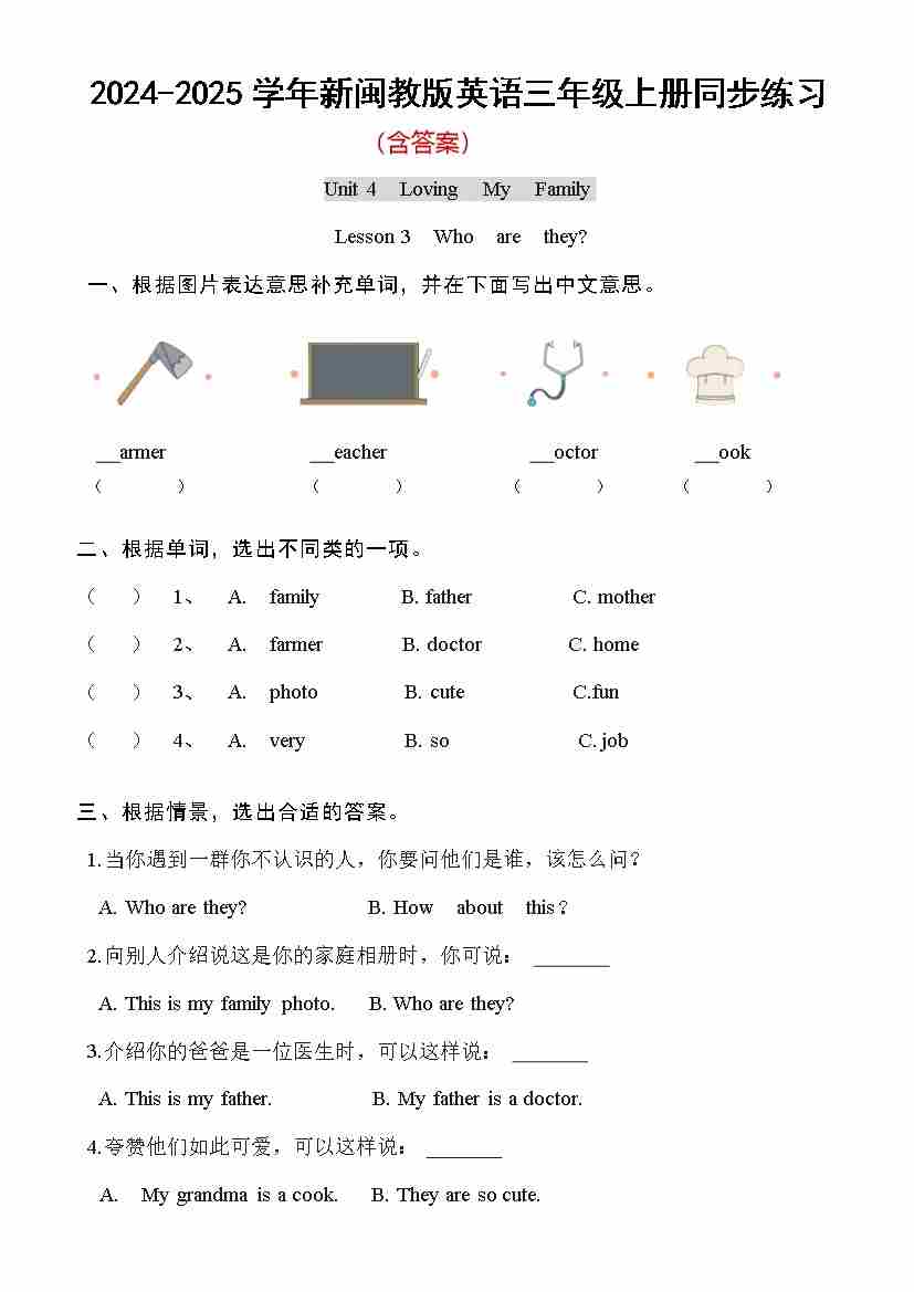 Unit 4 Loving My Family Lesson 3 Who are they? (同步练习)-2024-2025学年新闽教版英语三年级上册