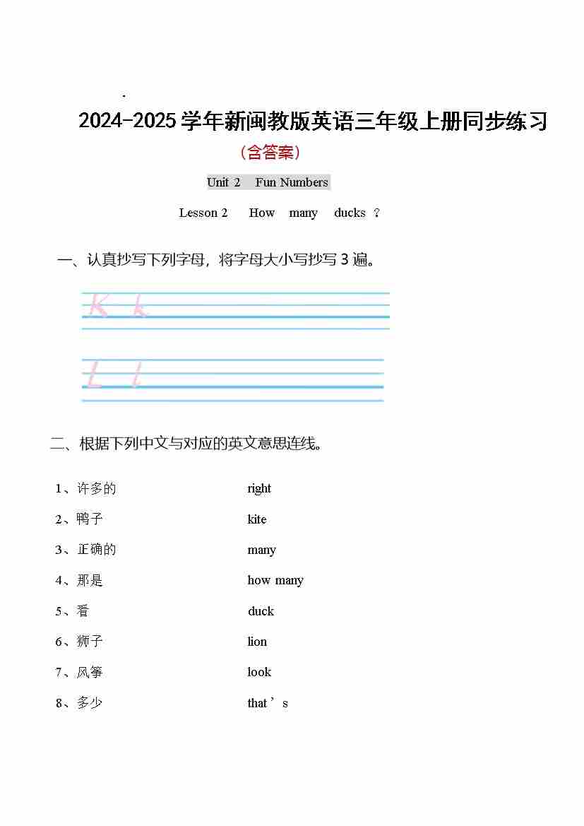 Unit2 Fun Numbers Lesson 2 How many ducks?(同步练习)-2024-2025学年新闽教版英语三年级上册
