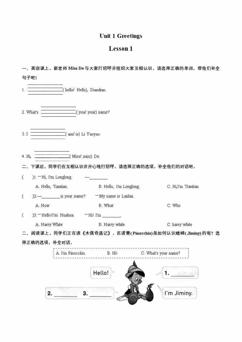 Unit 1 Greetings Lesson 1-2024-2025学年三年级英语上册课时练习(人教精通版)