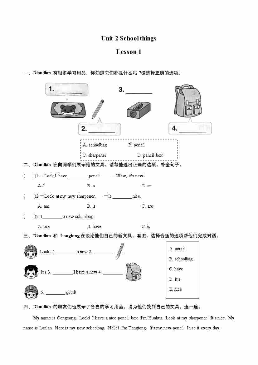 Unit 2 School things Lesson 1-2024-2025学年三年级英语上册课时练习(人教精通版)