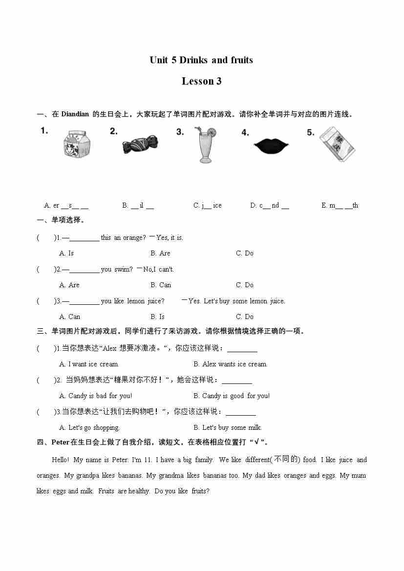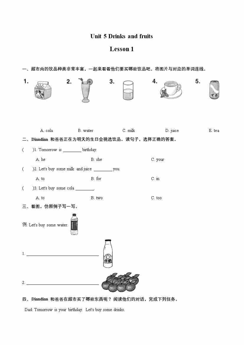 Unit 5 Drinks and fruits Lesson 1-2024-2025学年三年级英语上册课时练习(人教精通版)