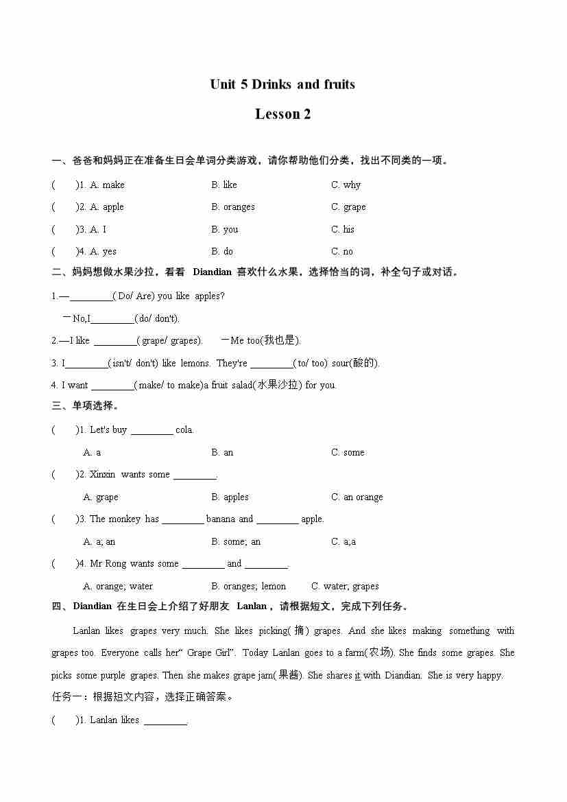 Unit 5 Drinks and fruits Lesson 2-2024-2025学年三年级英语上册课时练习(人教精通版)