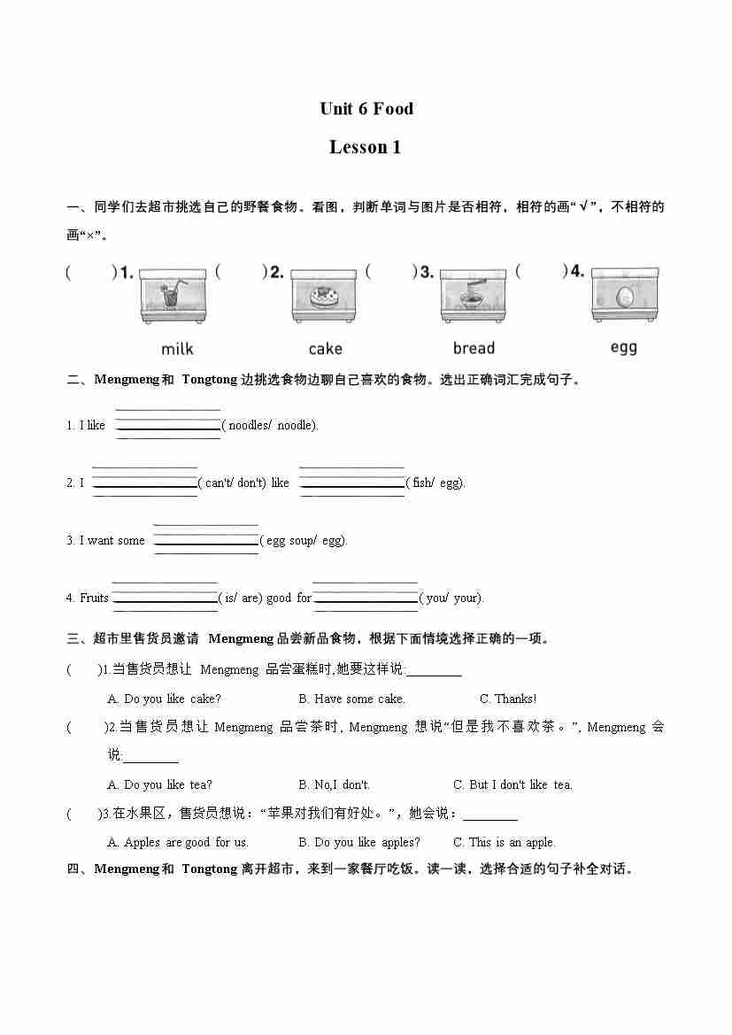 Unit 6 Food Lesson 1-2024-2025学年三年级英语上册课时练习(人教精通版)