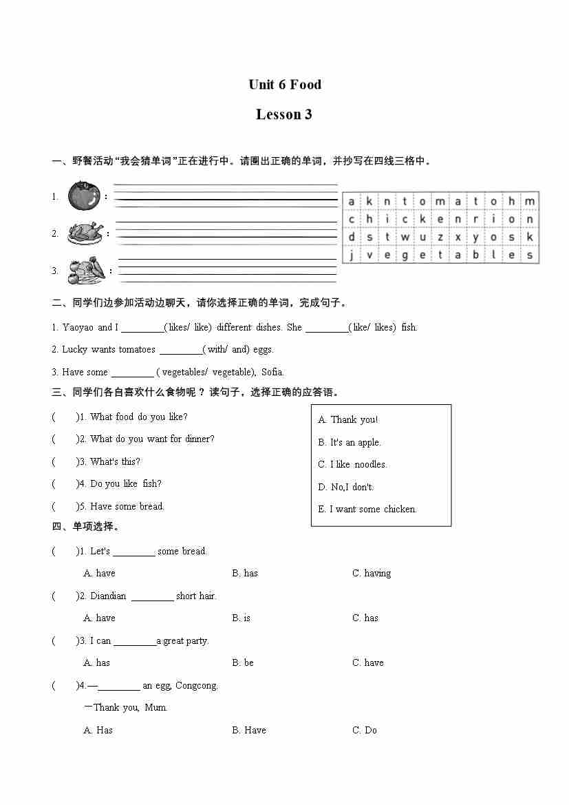 Unit 6 Food Lesson 3-2024-2025学年三年级英语上册课时练习(人教精通版)