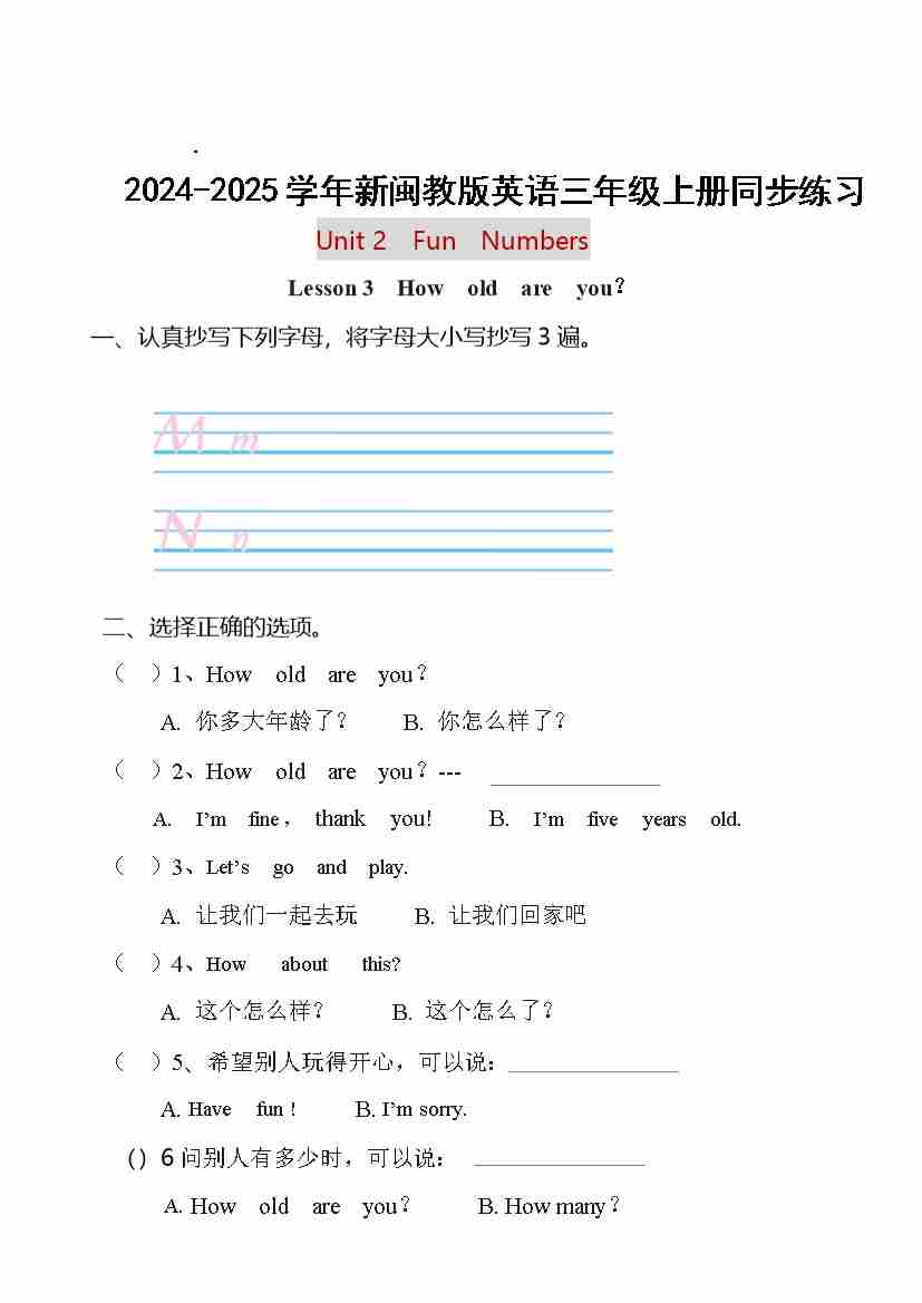 Unit 2 Fun Numbers Lesson 3 How old are you?(同步练)-2024-2025学年闽教版(2024)英语三年级上册