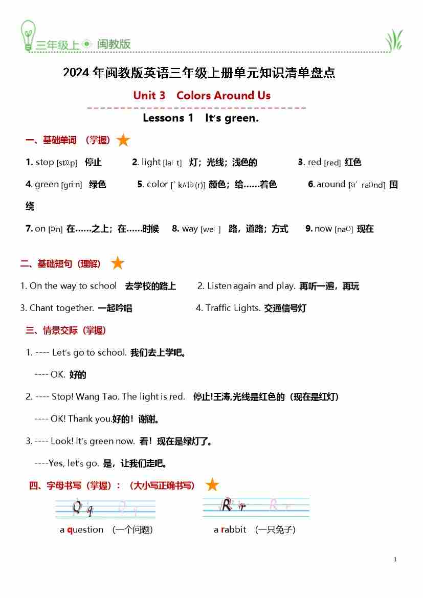 Unit 3 Colors Around Us (知识清单)-2024-2025学年闽教版(2024)英语三年级上册
