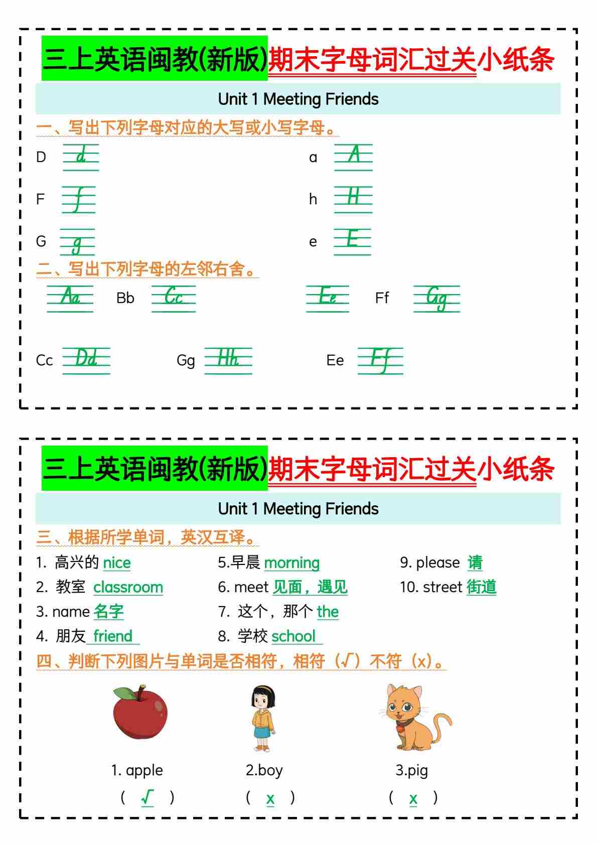 三上英语闽教(新版)期末字母词汇过关小纸条【答案】