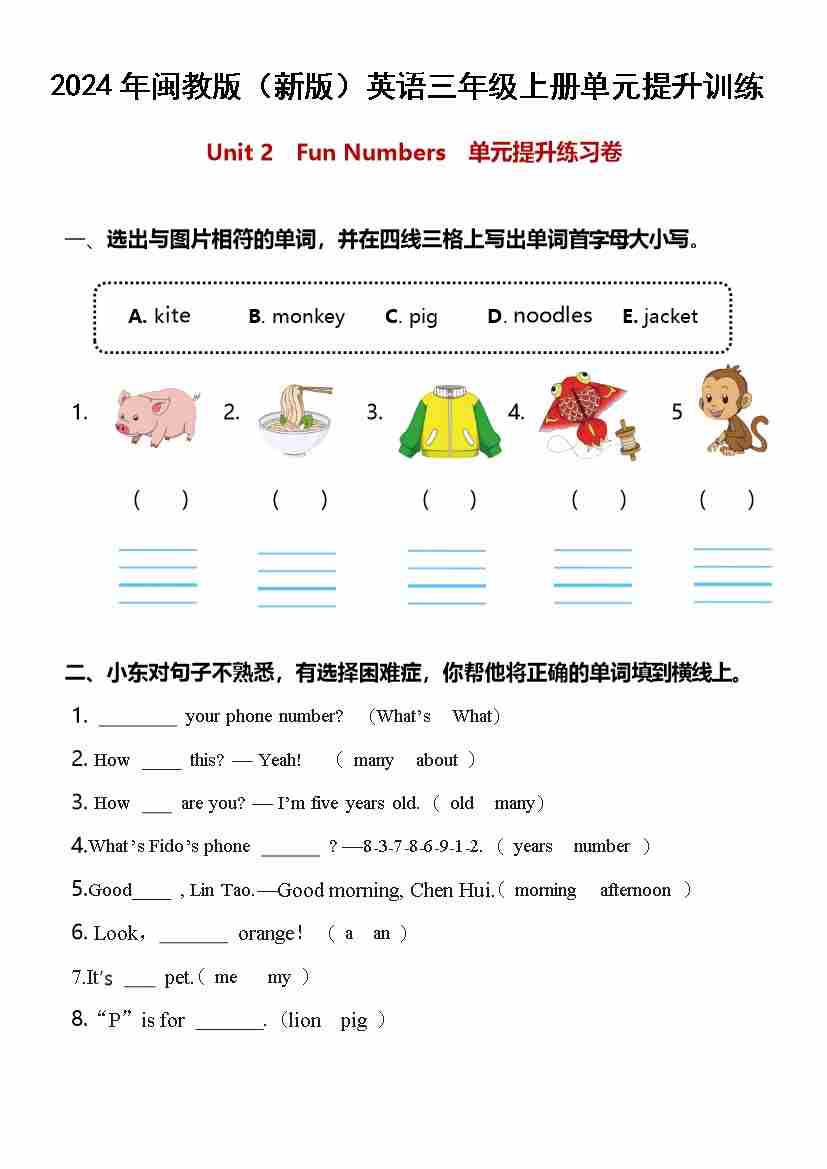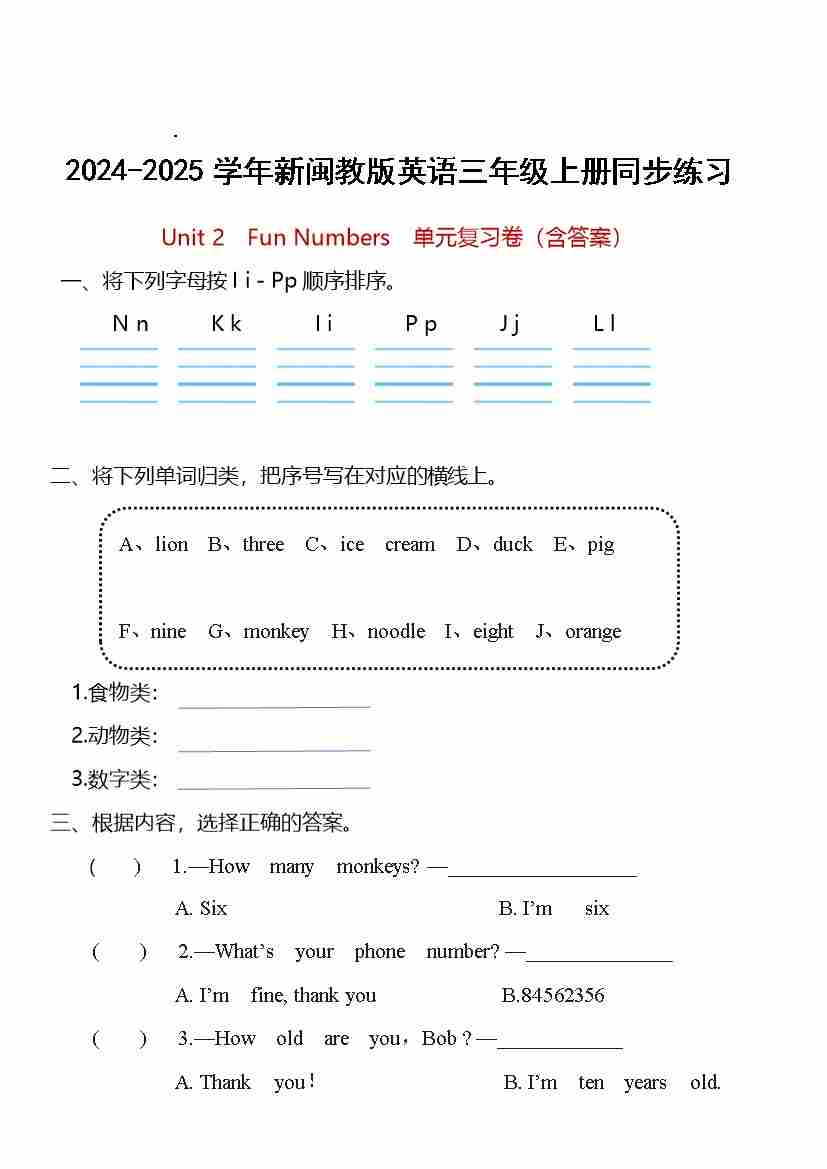Unit 2 Fun Numbers(单元测试)-2024-2025学年闽教版(2024)英语三年级上册