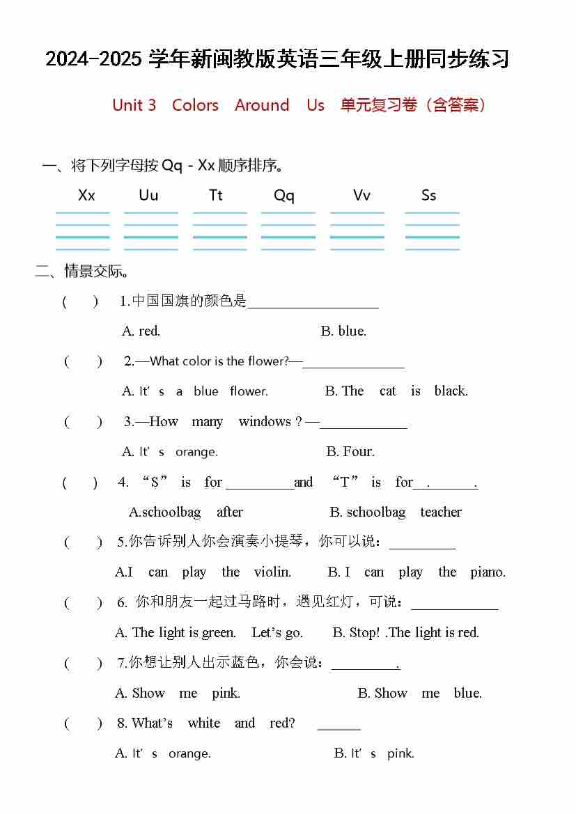 Unit 3 Colors Around Us (单元测试)-2024-2025学年新闽教版英语三年级上册